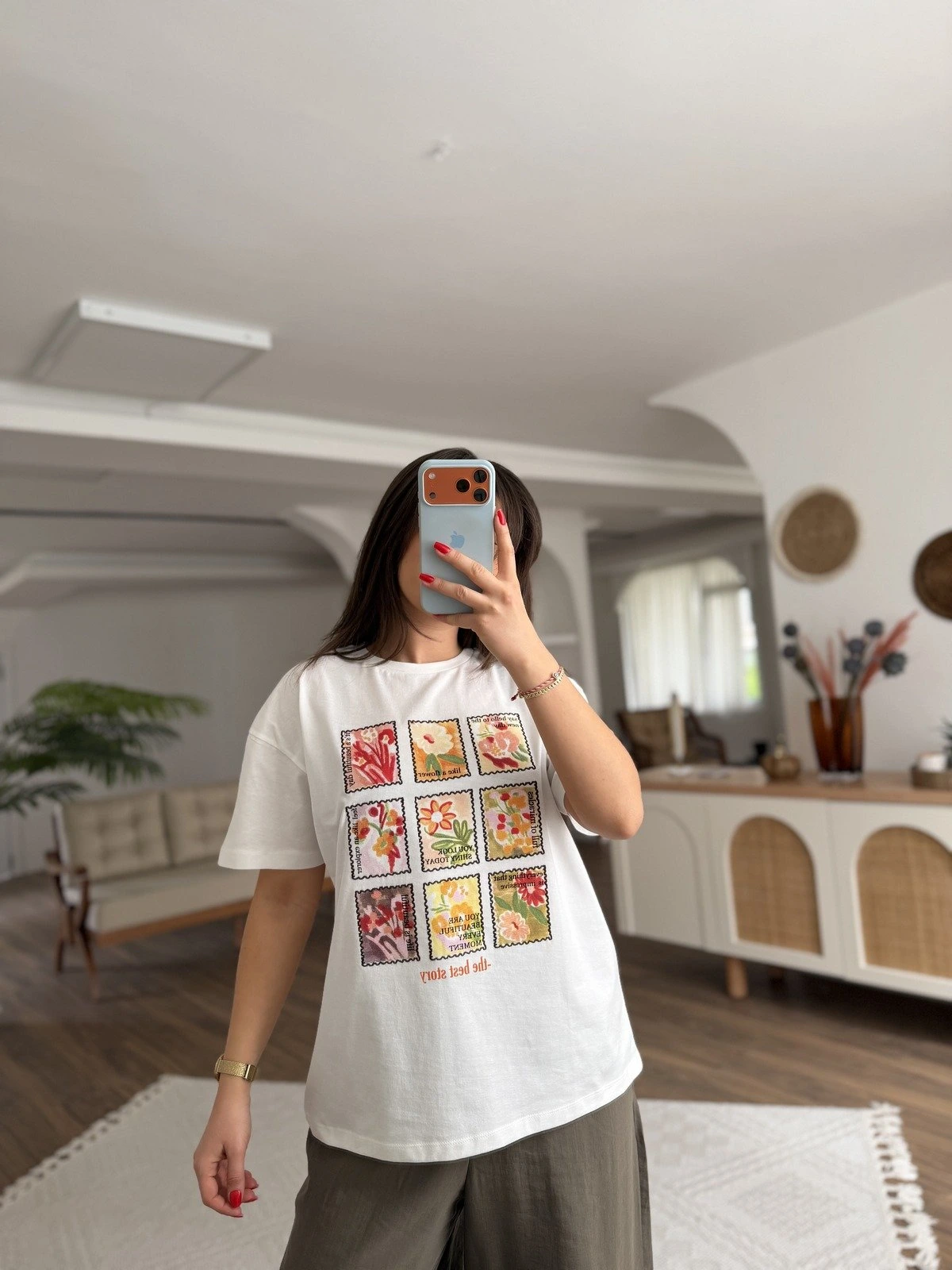 ÖN ÇİÇEK BASKI PAMUK SALAŞ TİŞÖRT – EKRU