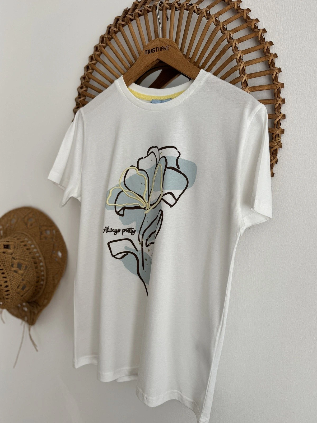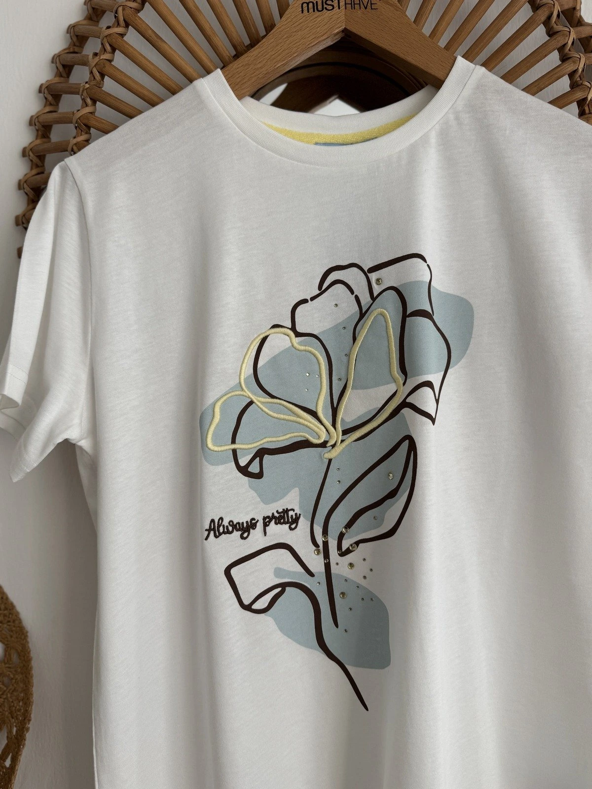 ÖN ÇİÇEK NAKIŞ TAŞ SERPME PAMUK TİŞÖRT – EKRU
