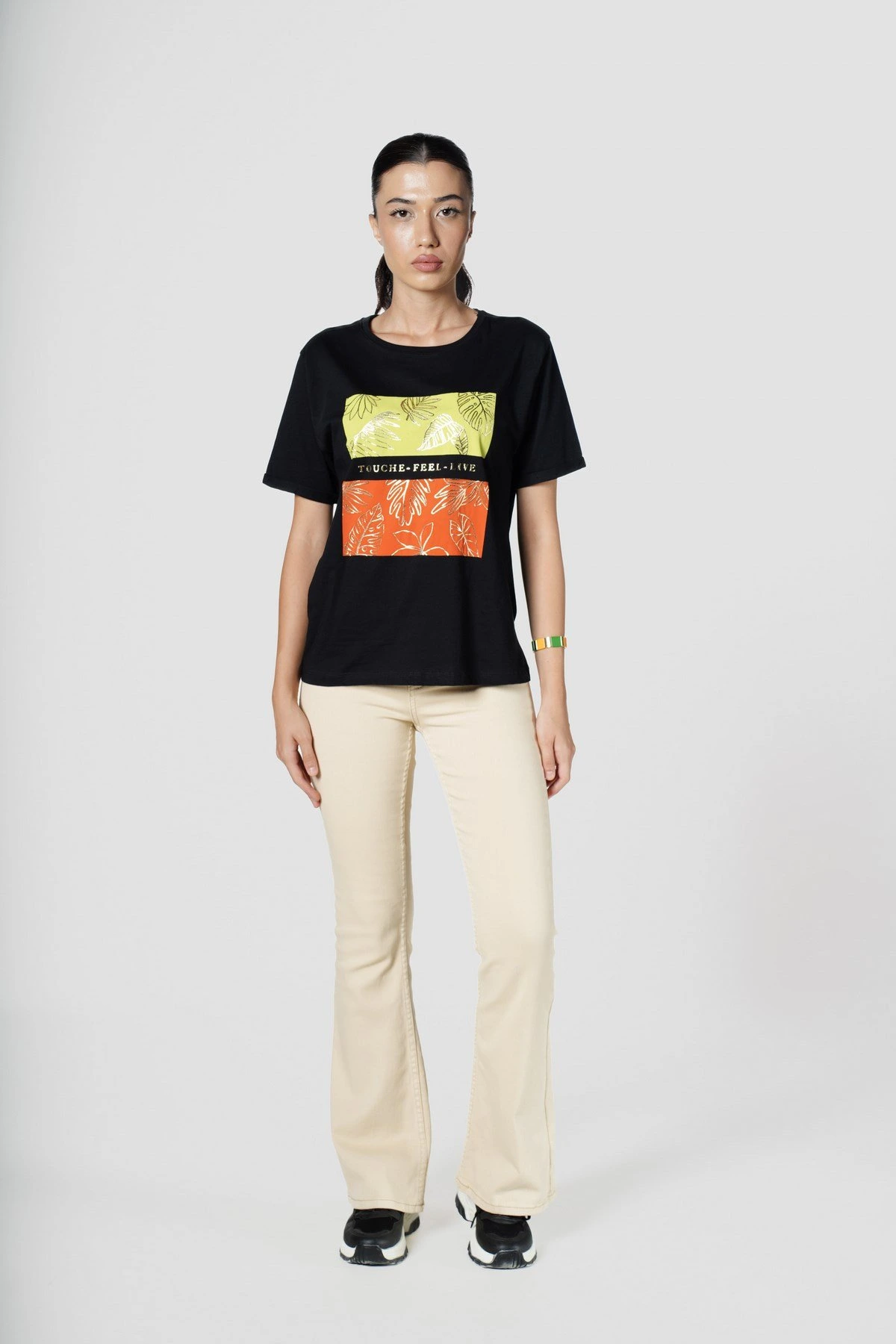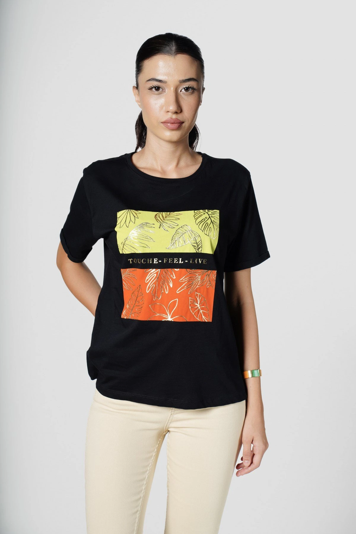 ÖN ÇİFT RENK VE SİMLİ BASKI KISA KOL TİŞÖRT – SİYAH