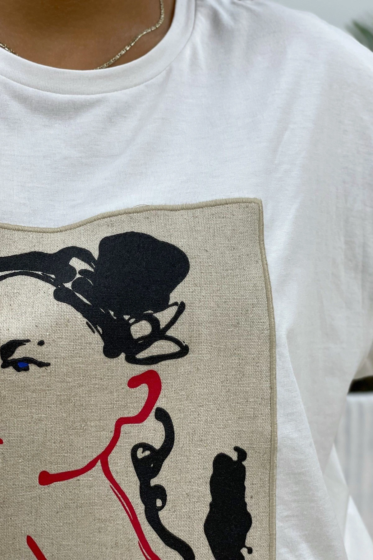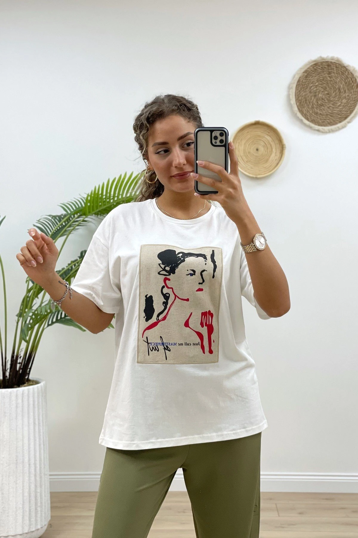 ÖN KETEN KIZ BASKI TİŞÖRT – EKRU