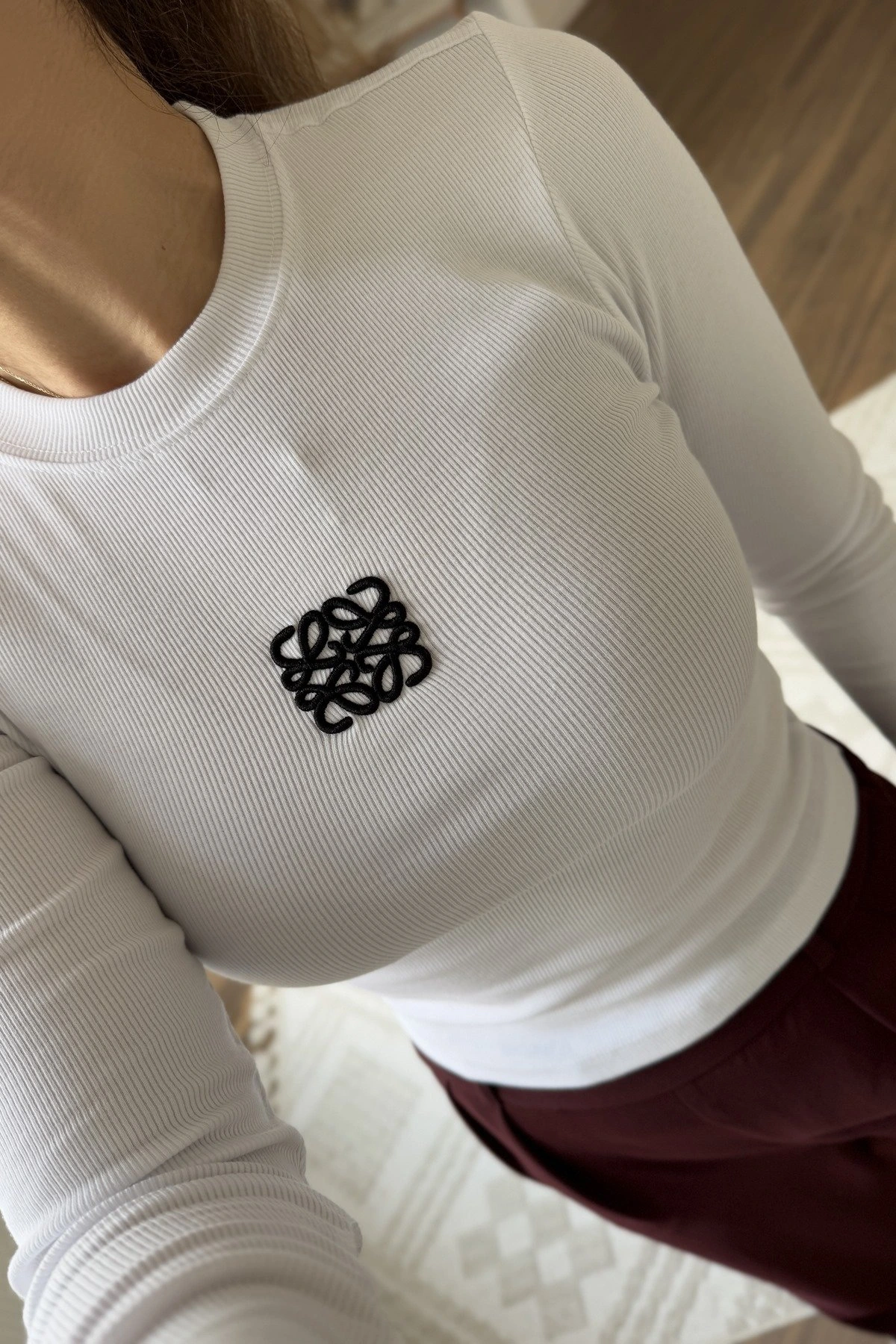 ÖN NAKIŞLI FİTİLLİ PAMUK LİKRA UZUN KOL TİŞÖRT – BEYAZ-SİYAH