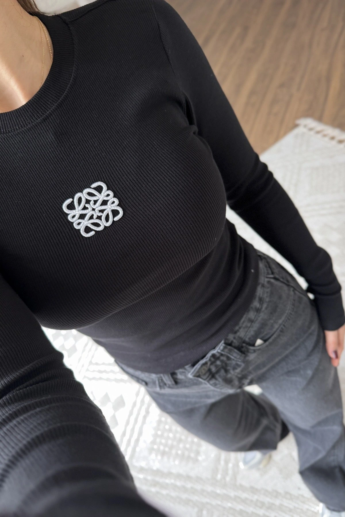 ÖN NAKIŞLI FİTİLLİ PAMUK LİKRA UZUN KOL TİŞÖRT – SİYAH BEYAZ