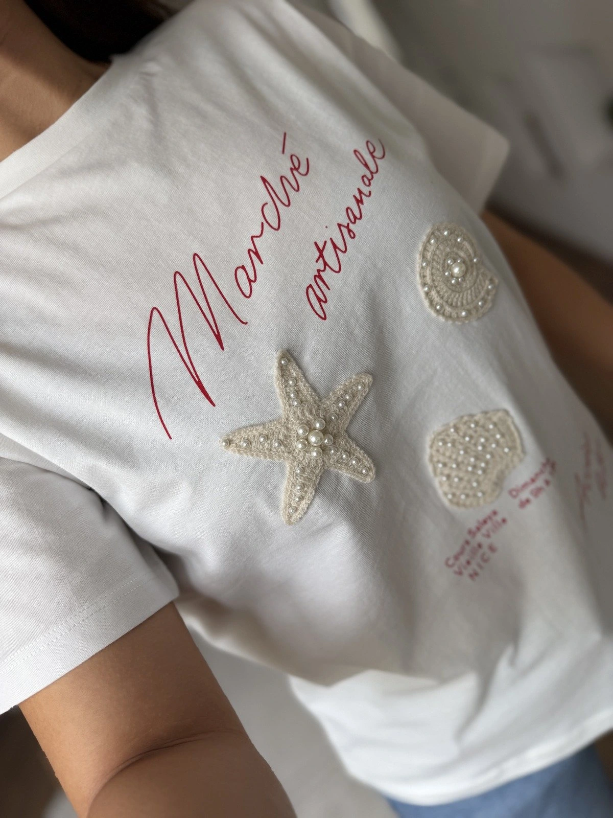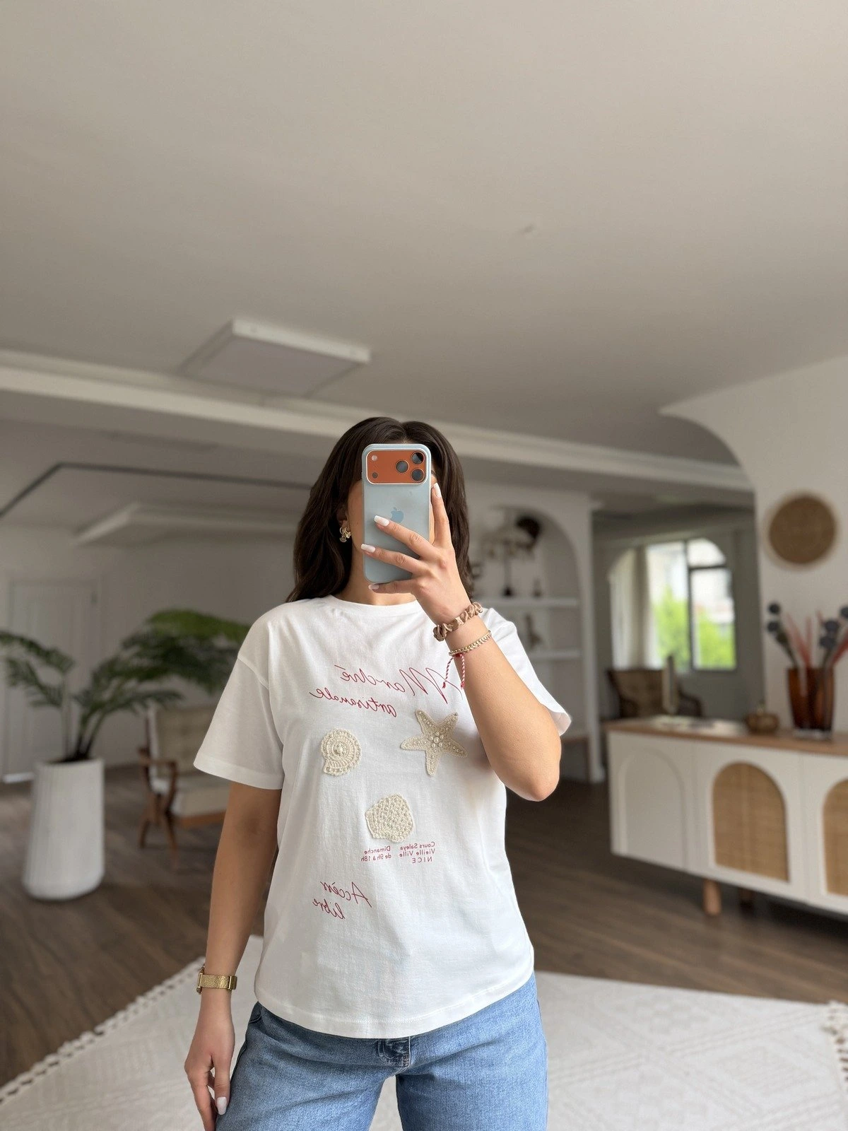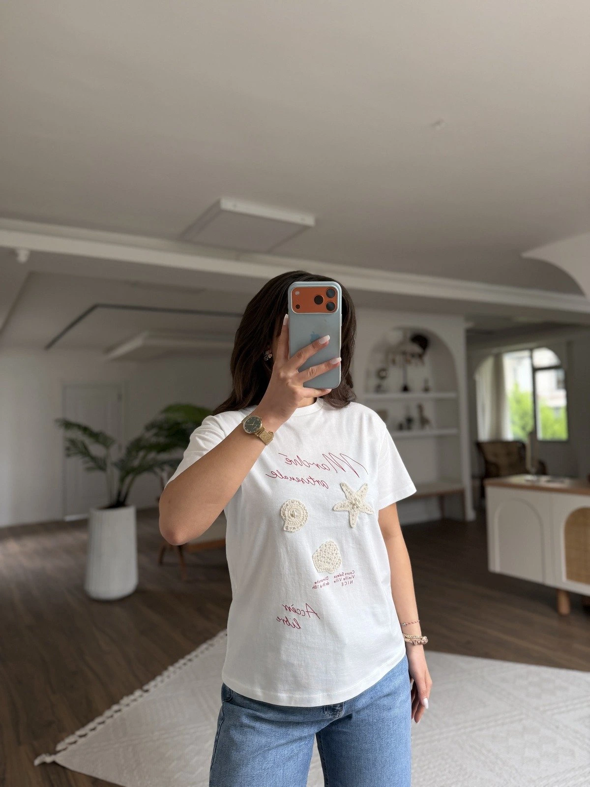 ÖN ÖRGÜ İNCİ DETAY PAMUK SALAŞ TİŞÖRT – EKRU