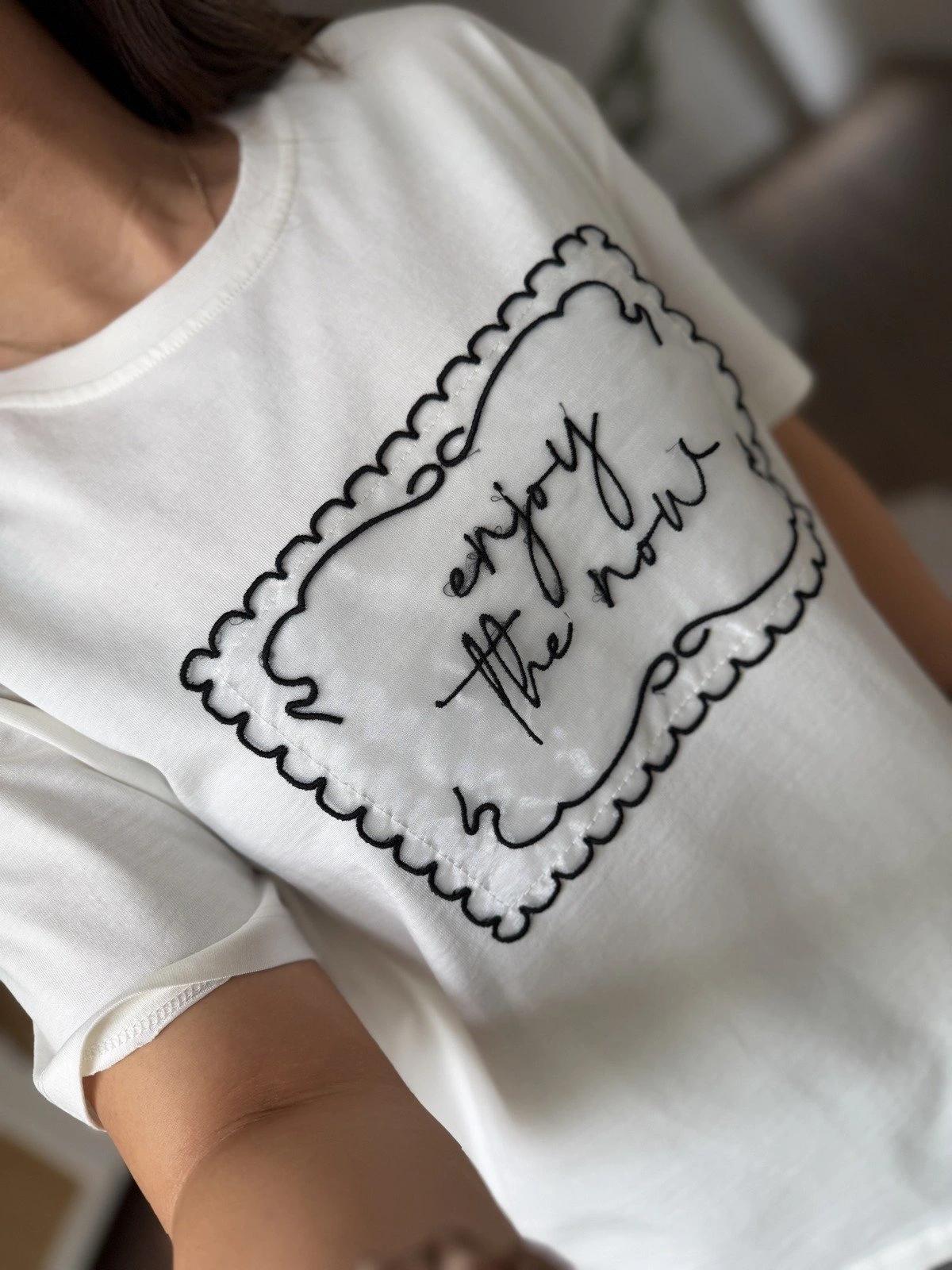 ORGANZE YAZI NAKIŞ DETAY KISA KOL PAMUK TİŞÖRT – EKRU