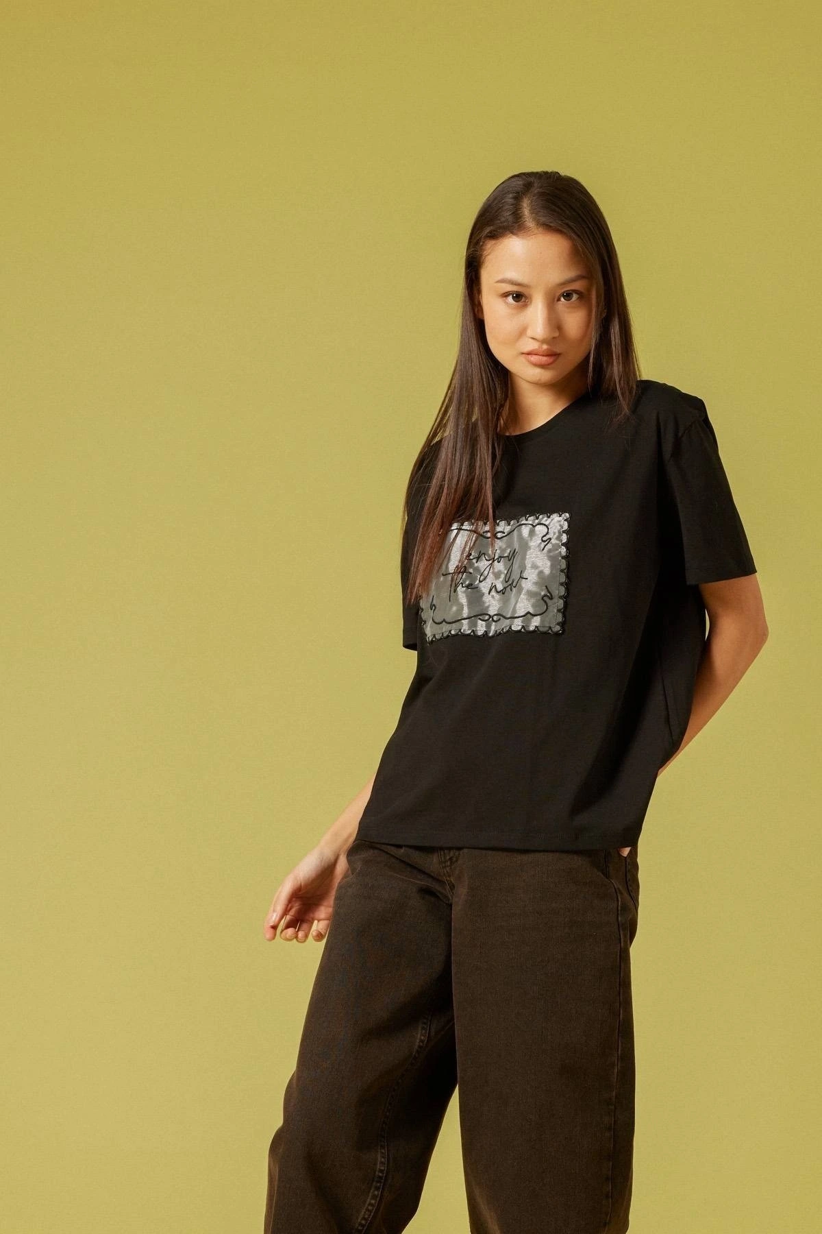 ORGANZE YAZI NAKIŞ DETAY KISA KOL PAMUK TİŞÖRT – SİYAH