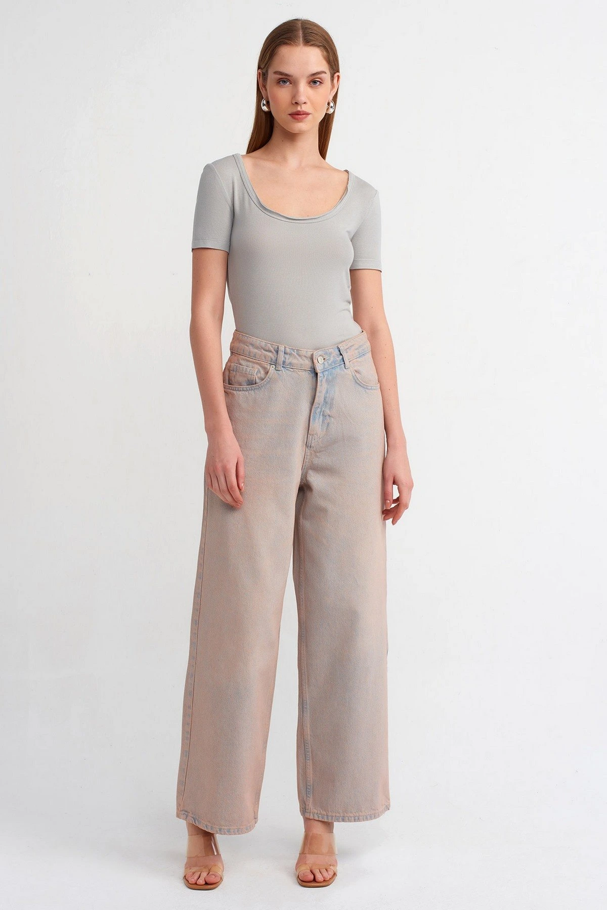 OVAL YAKA VİSKON LİKRALI BASİC TİŞÖRT - BEJ