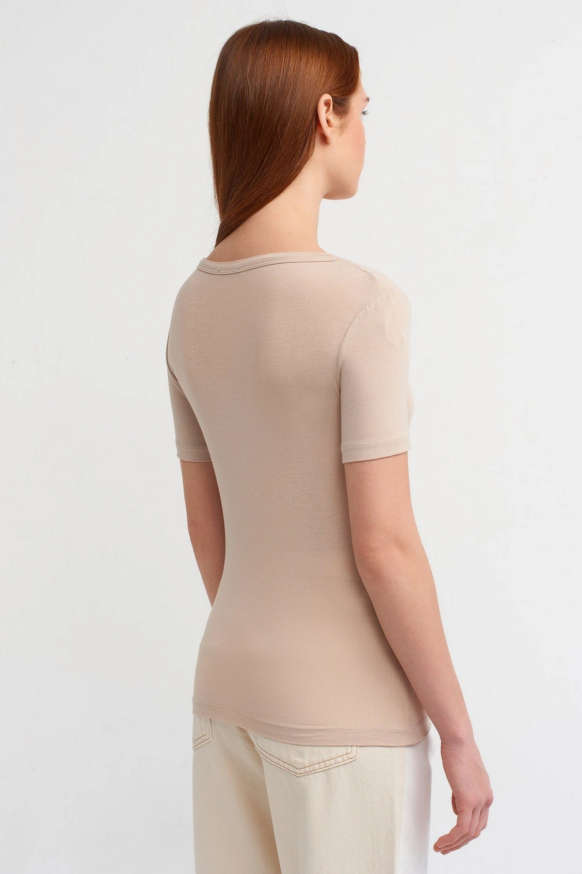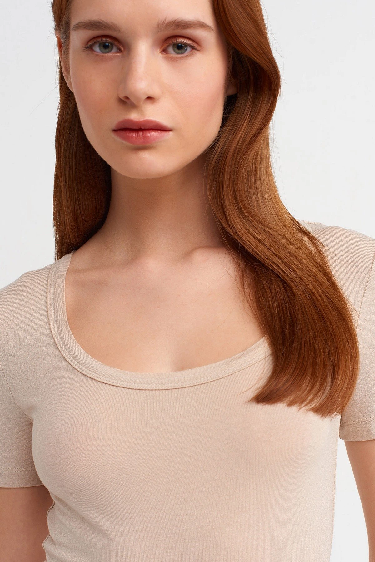 OVAL YAKA VİSKON LİKRALI BASİC TİŞÖRT – BEJ