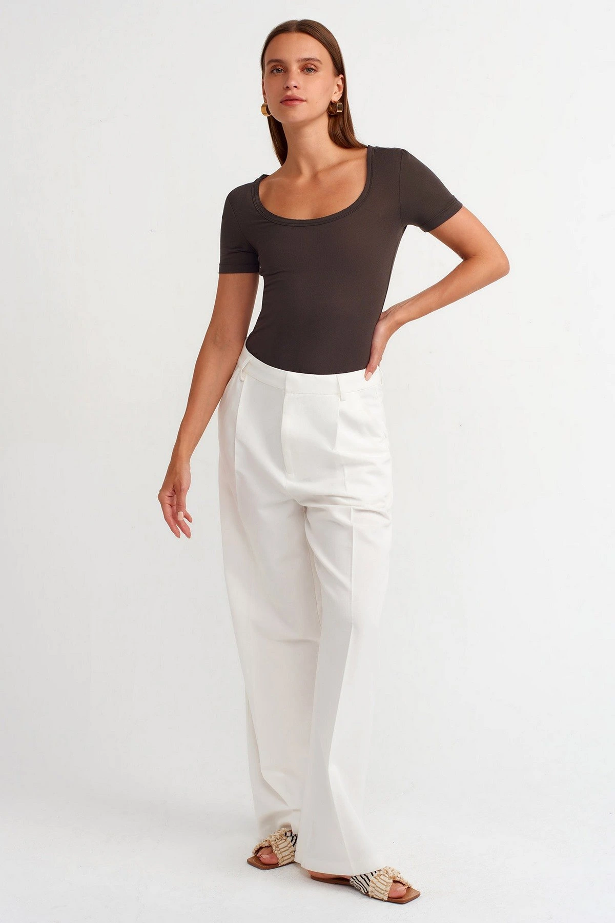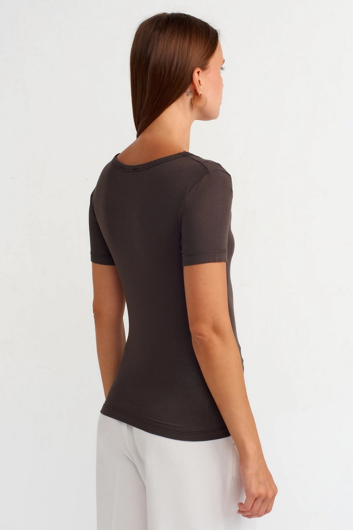 OVAL YAKA VİSKON LİKRALI BASİC TİŞÖRT – KOYU KAHVE