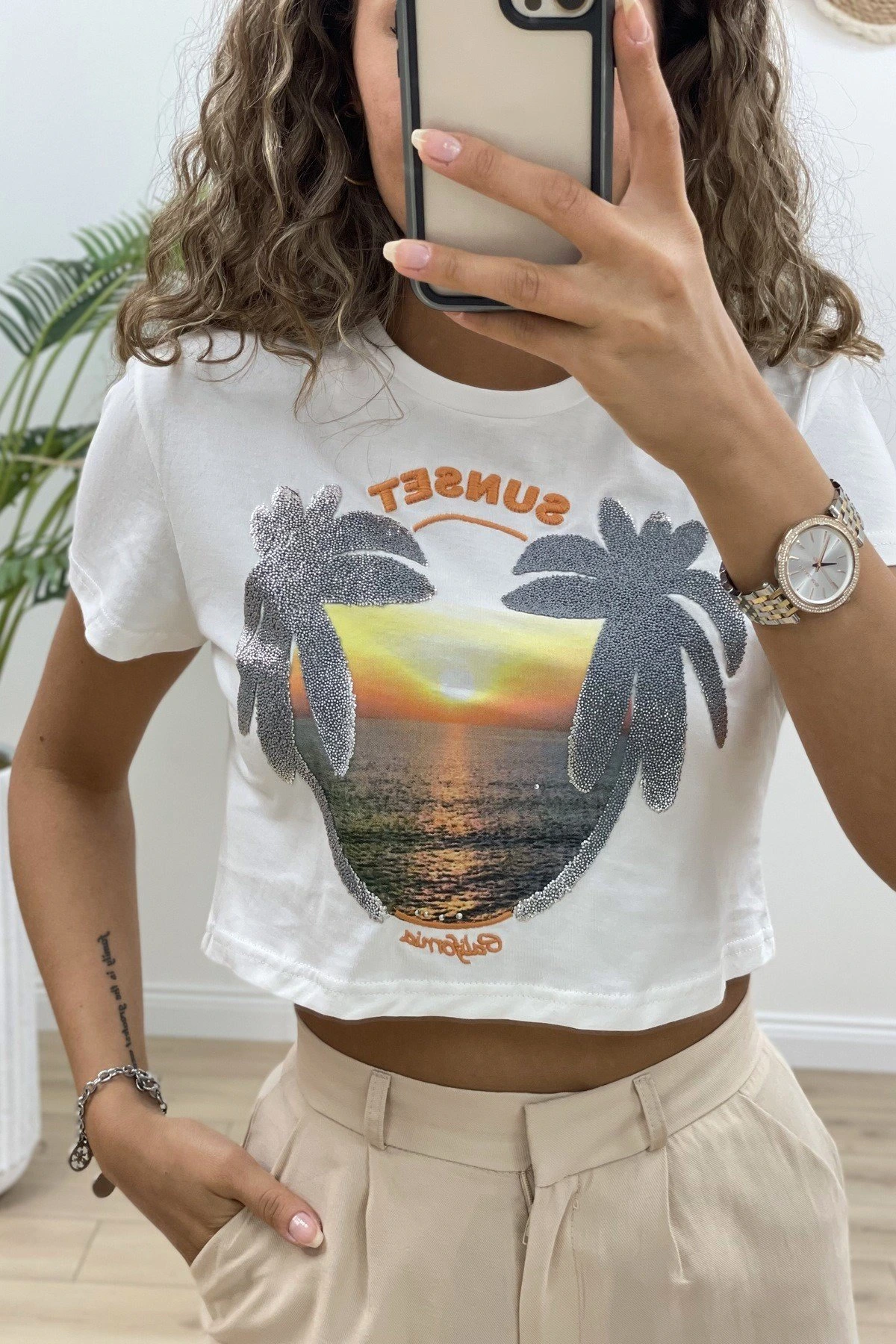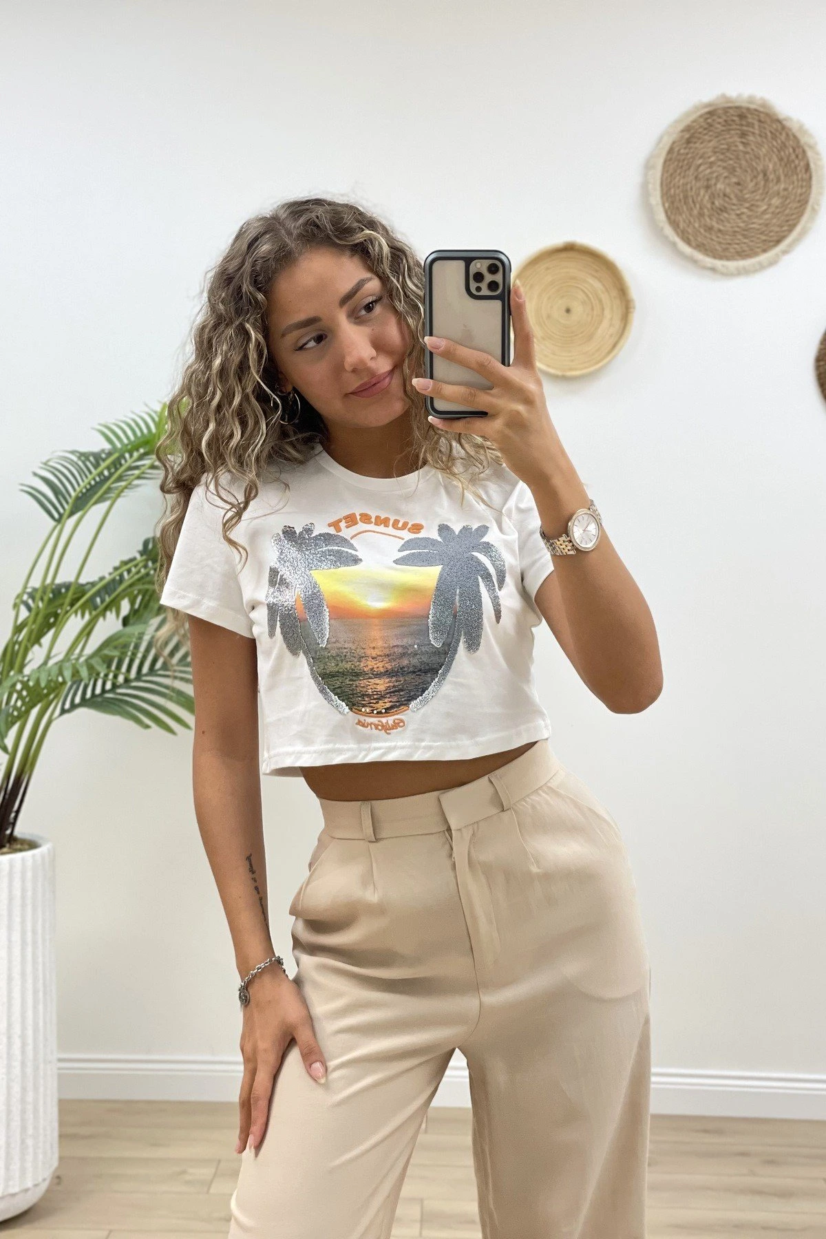 PALMİYE BONCUK BASKI CROP TİŞÖRT – EKRU