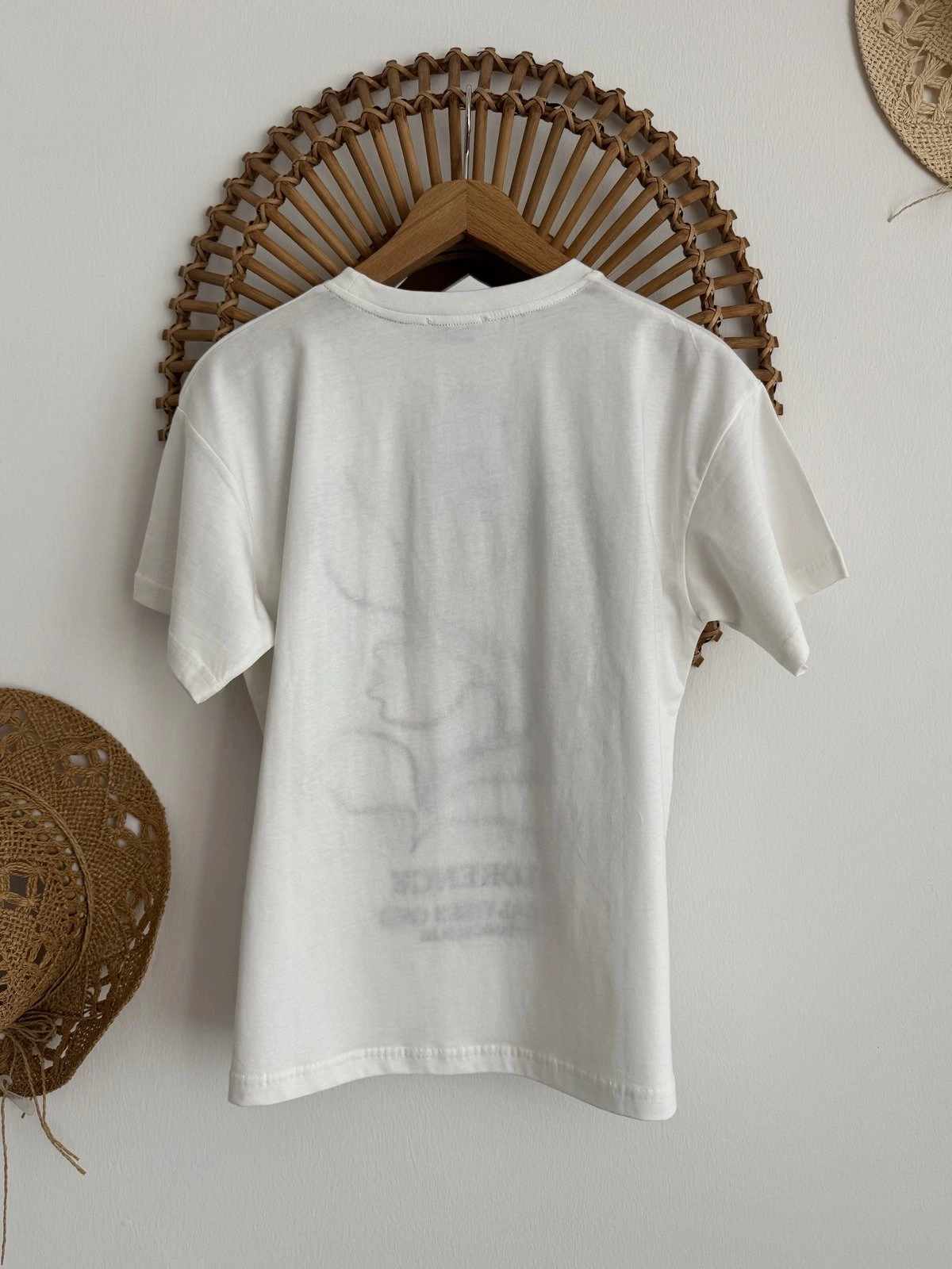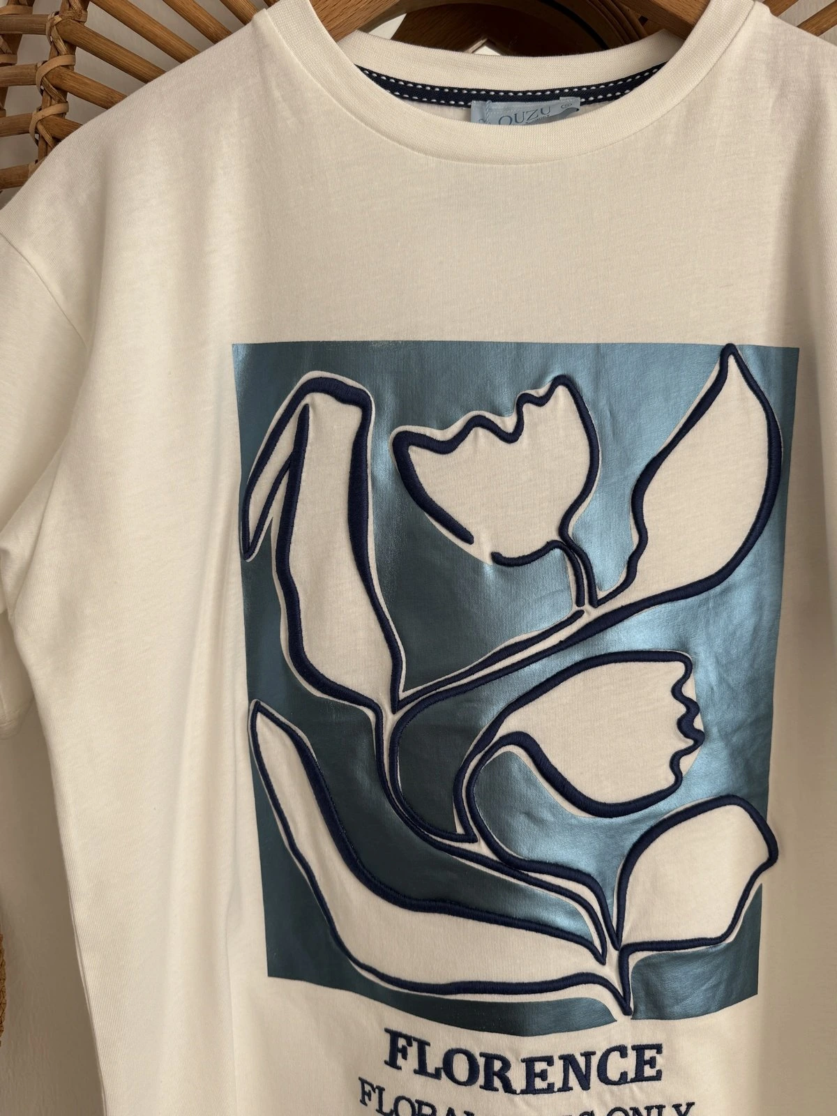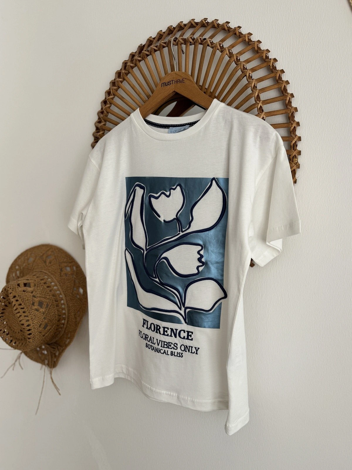 PARLAK BASKI ÇİÇEK NAKIŞ FLORANSE YAZILI PAMUK TİŞÖRT – EKRU