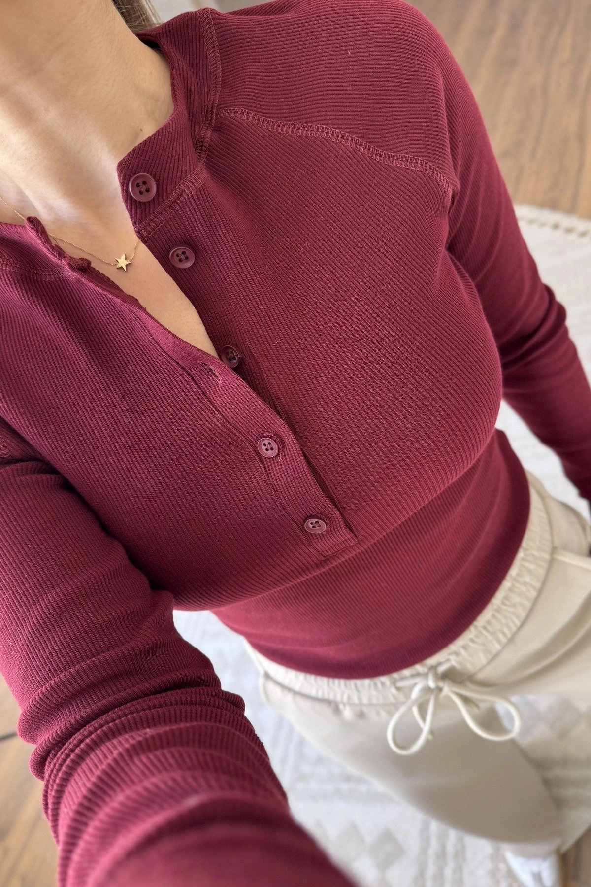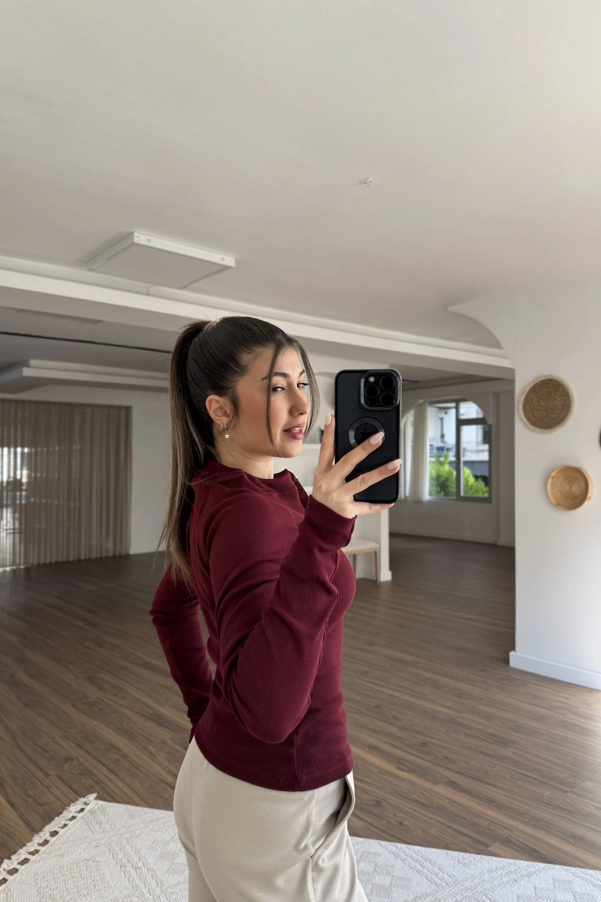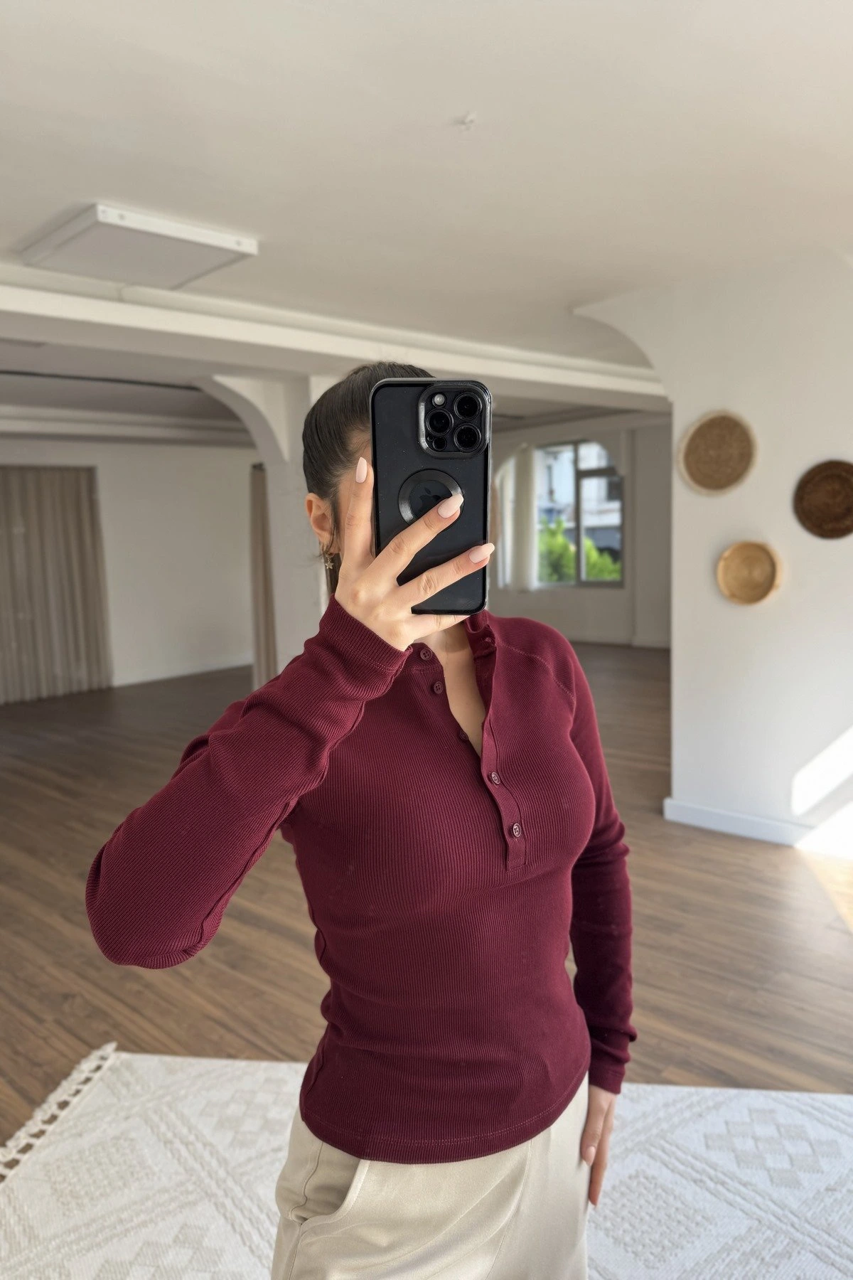 REGLAN KOL YARI PATLI FİTİLLİ PAMUK UZUN KOL TİŞÖRT – BORDO