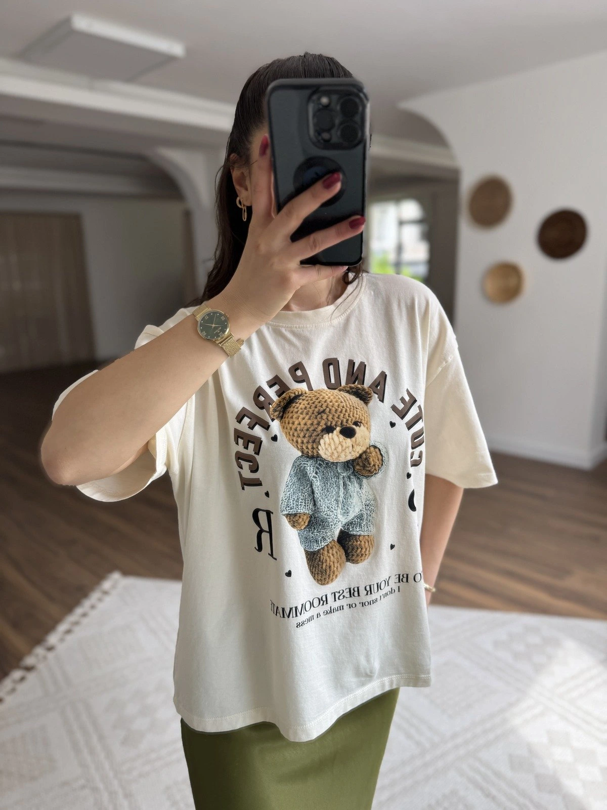TEDDY BEAR BASKI PAMUK SALAŞ TİŞÖRT – EKRU