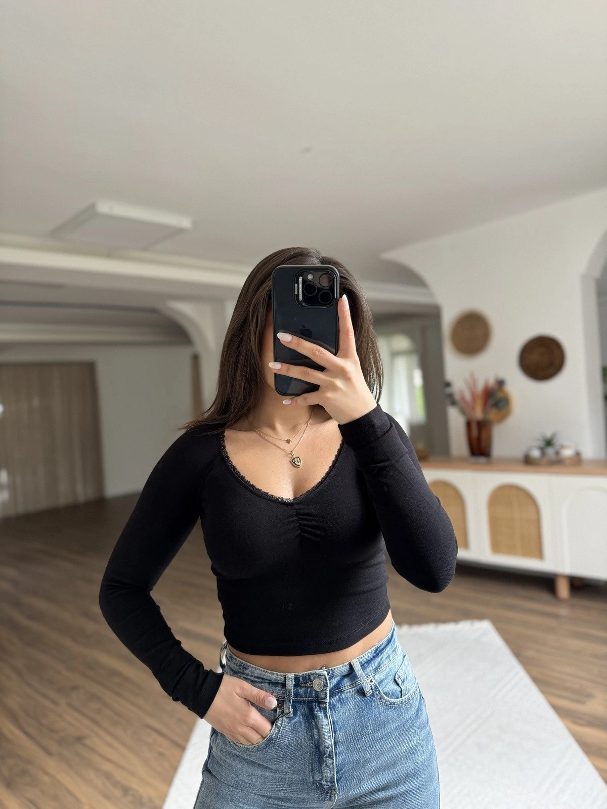 V YAKA DANTEL ŞERİT UZUN KOL PAMUK MODAL TİŞÖRT – SİYAH