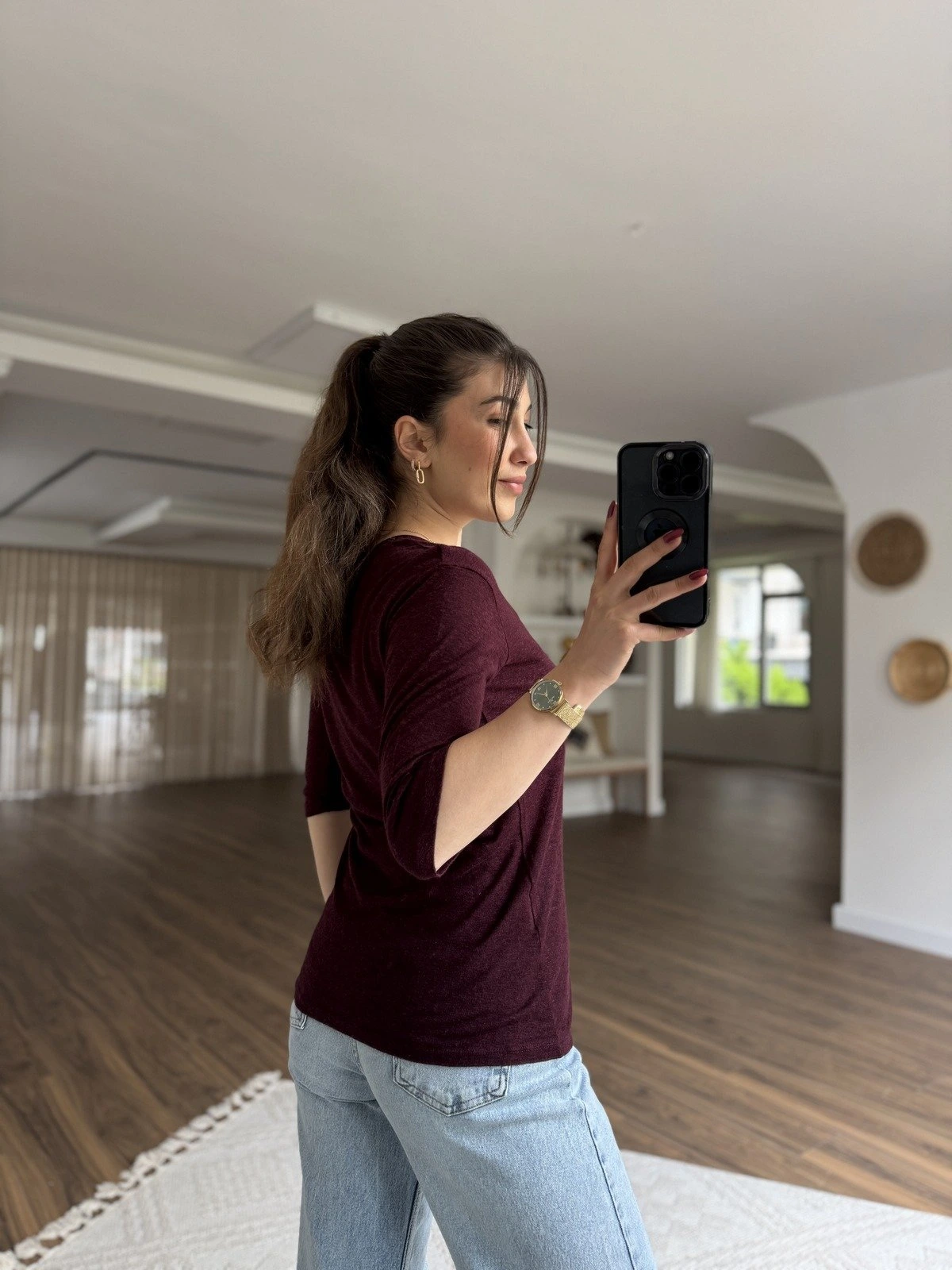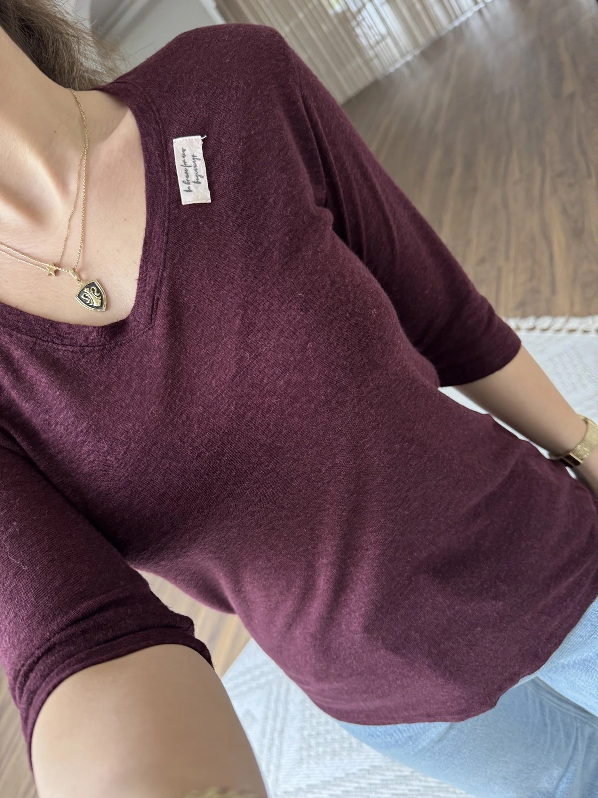 V YAKA ETİKET DETAY DOKULU KETEN TİŞÖRT – BORDO