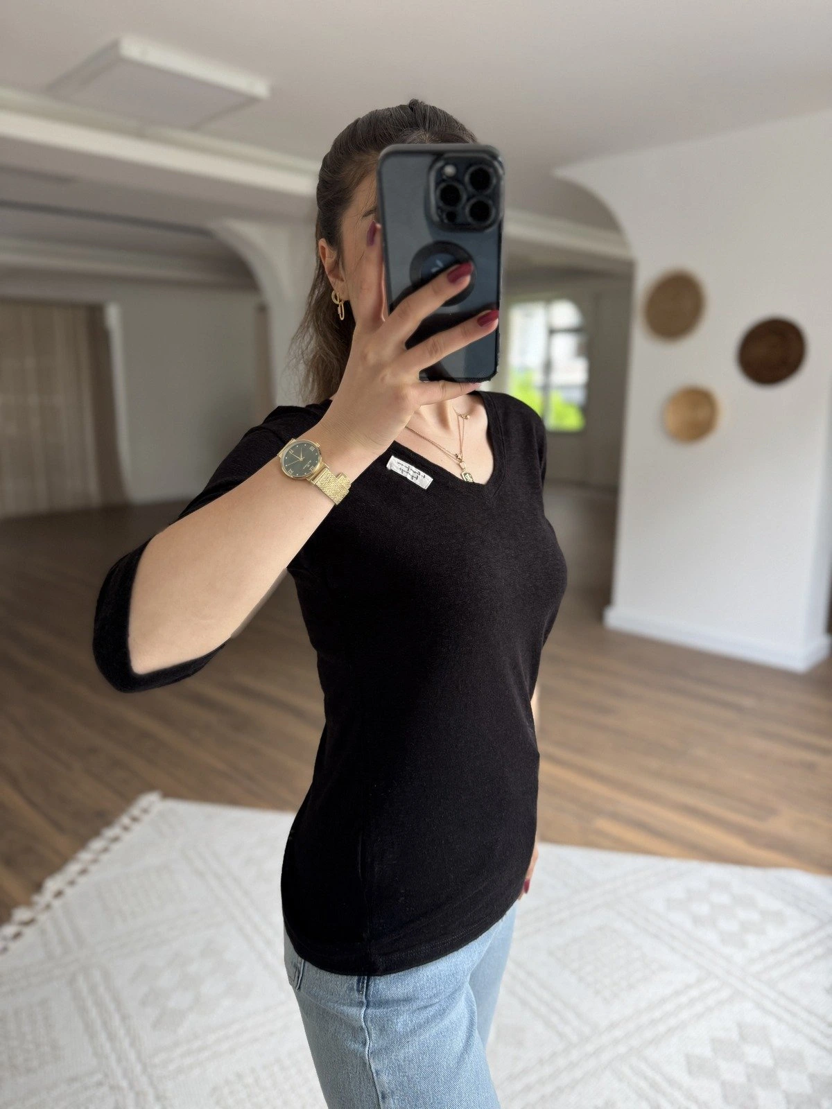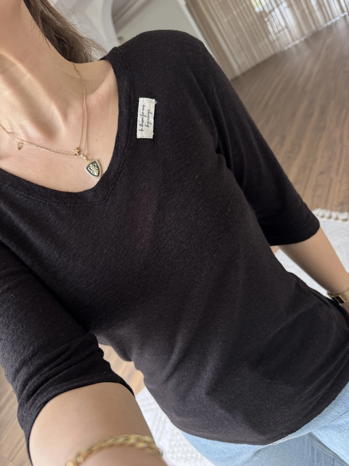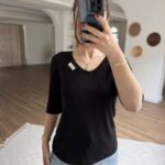 V YAKA ETİKET DETAY DOKULU KETEN TİŞÖRT – SİYAH