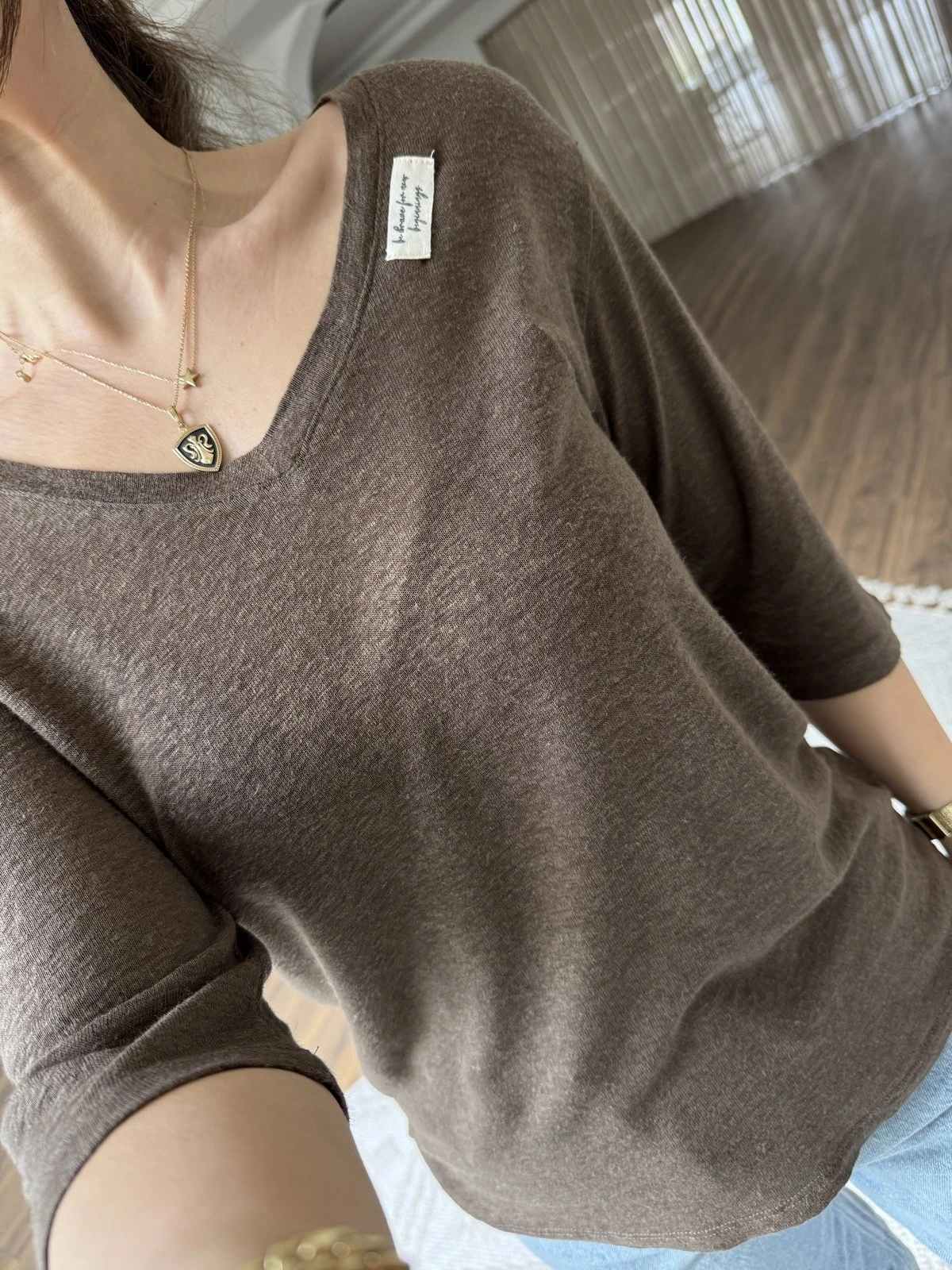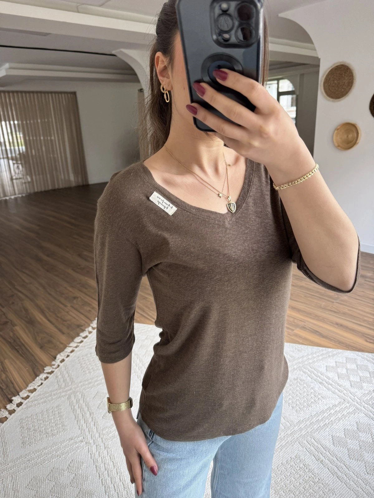 V YAKA ETİKET DETAY DOKULU KETEN TİŞÖRT – VİZON