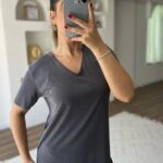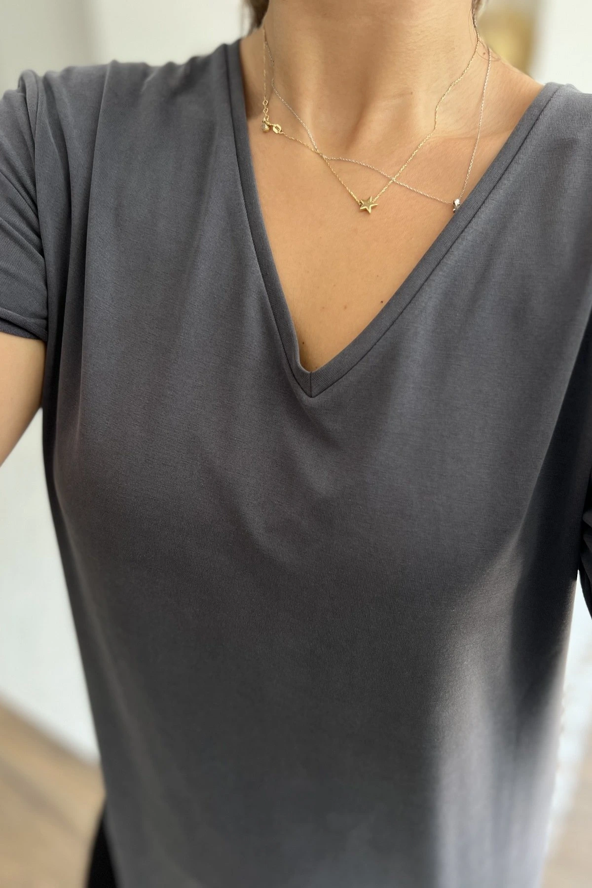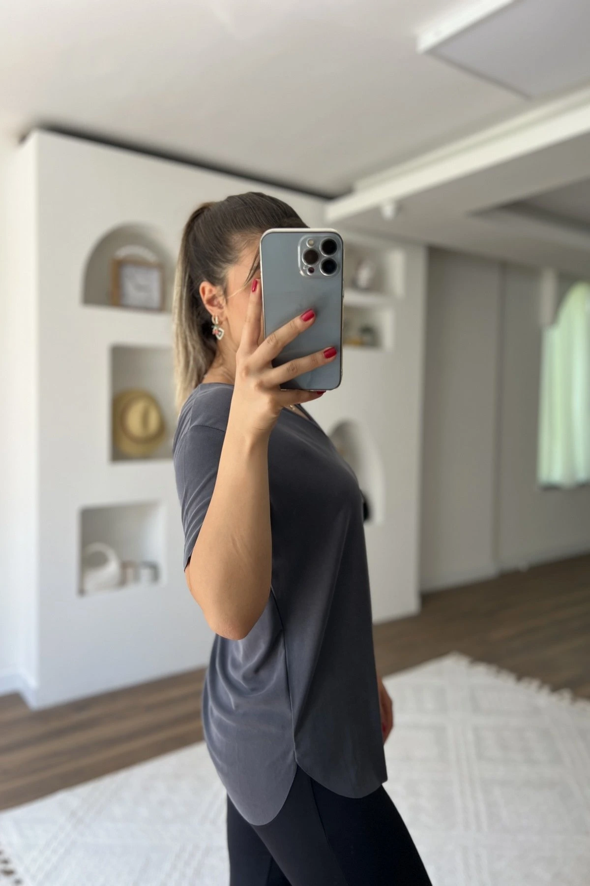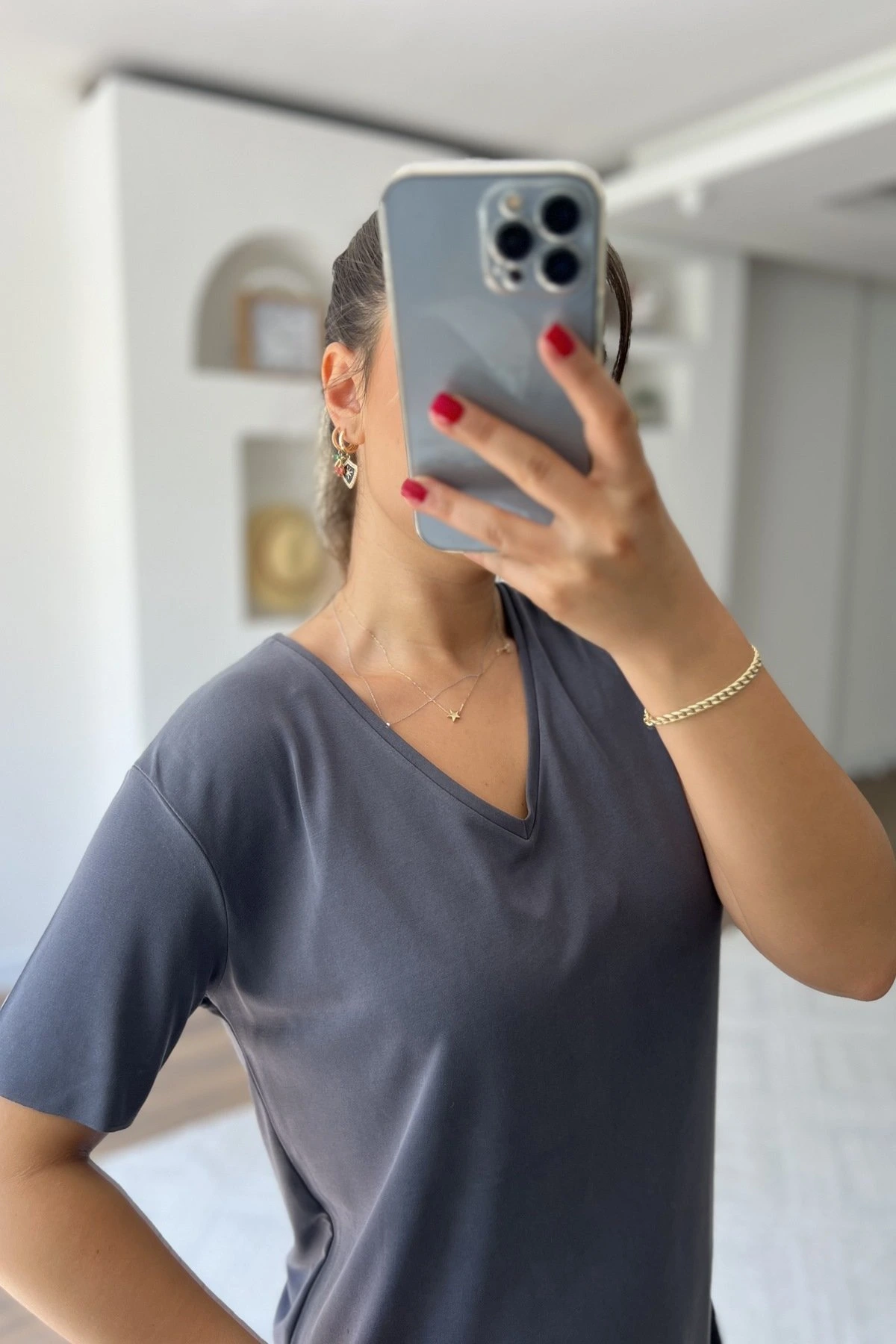 V YAKA LAZER KESİM LİKRALI MODAL TİŞÖRT – ANTRASİT