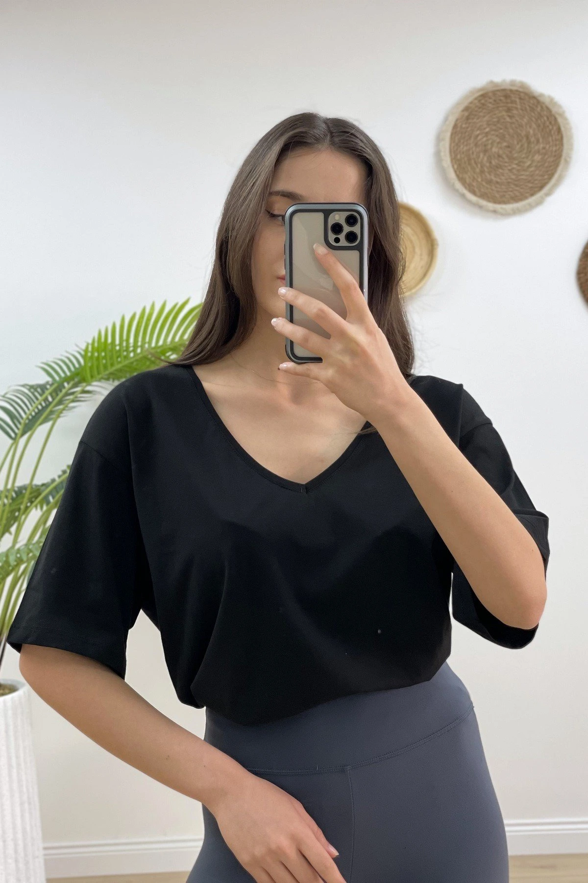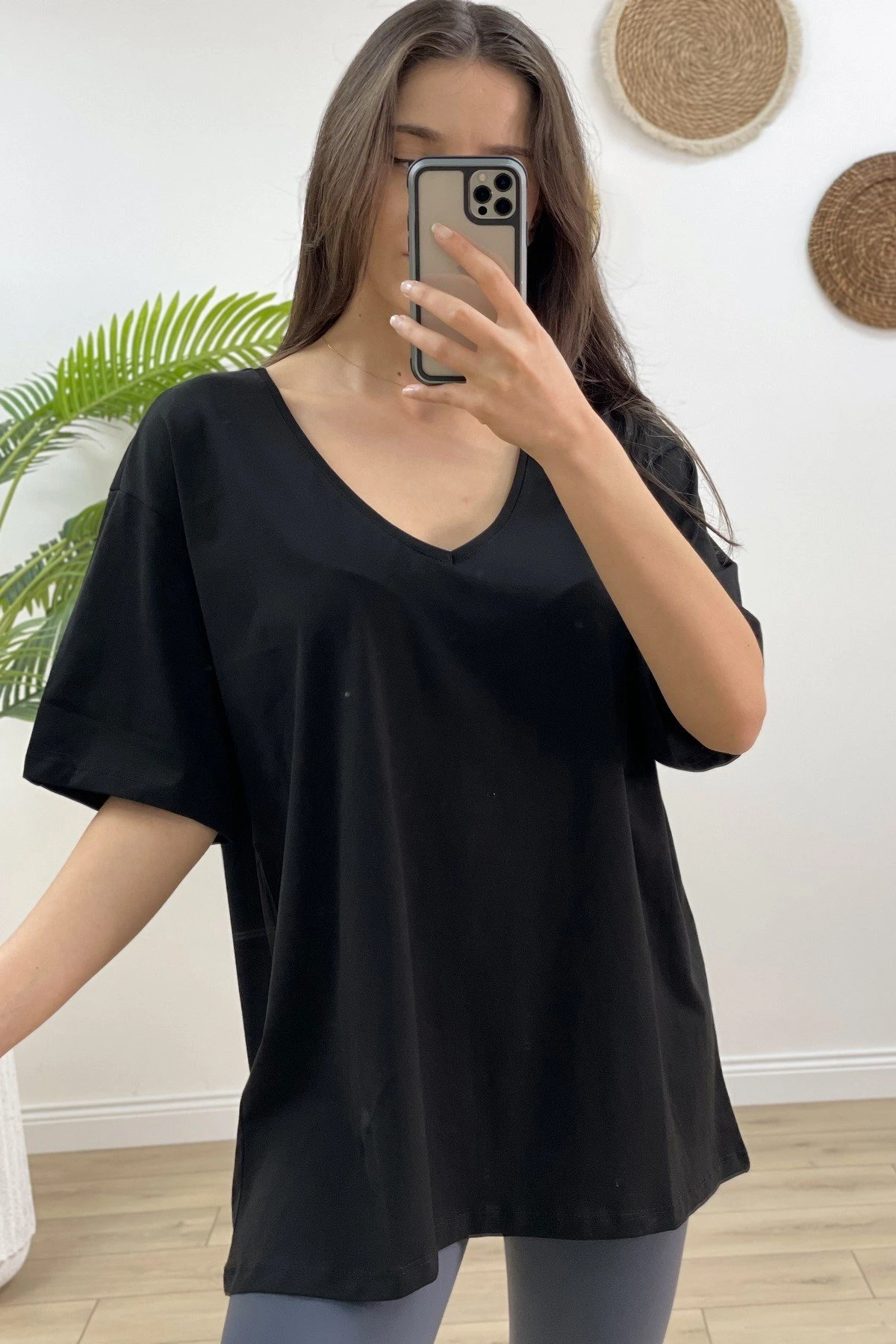 V YAKA OVERSİZE PAMUK TİŞÖRT – SİYAH