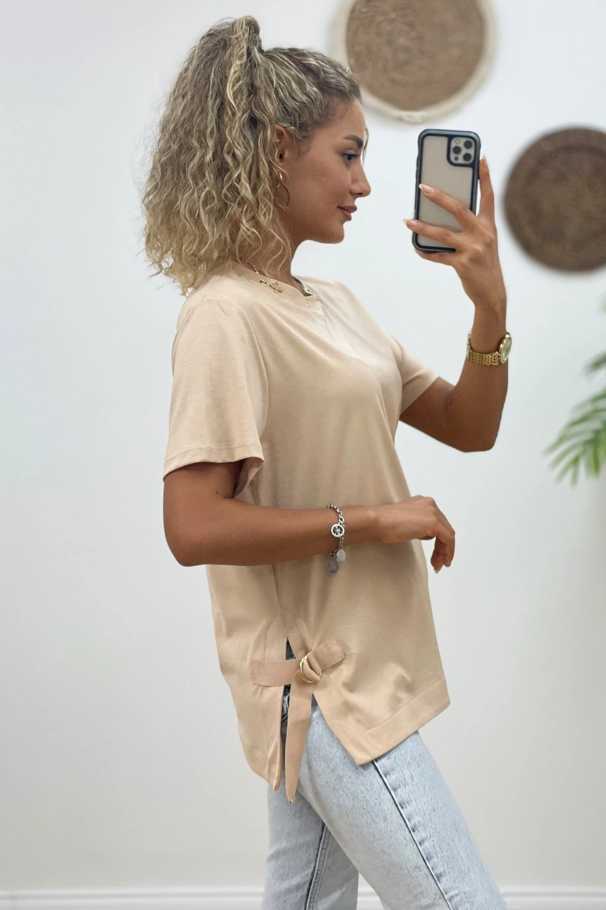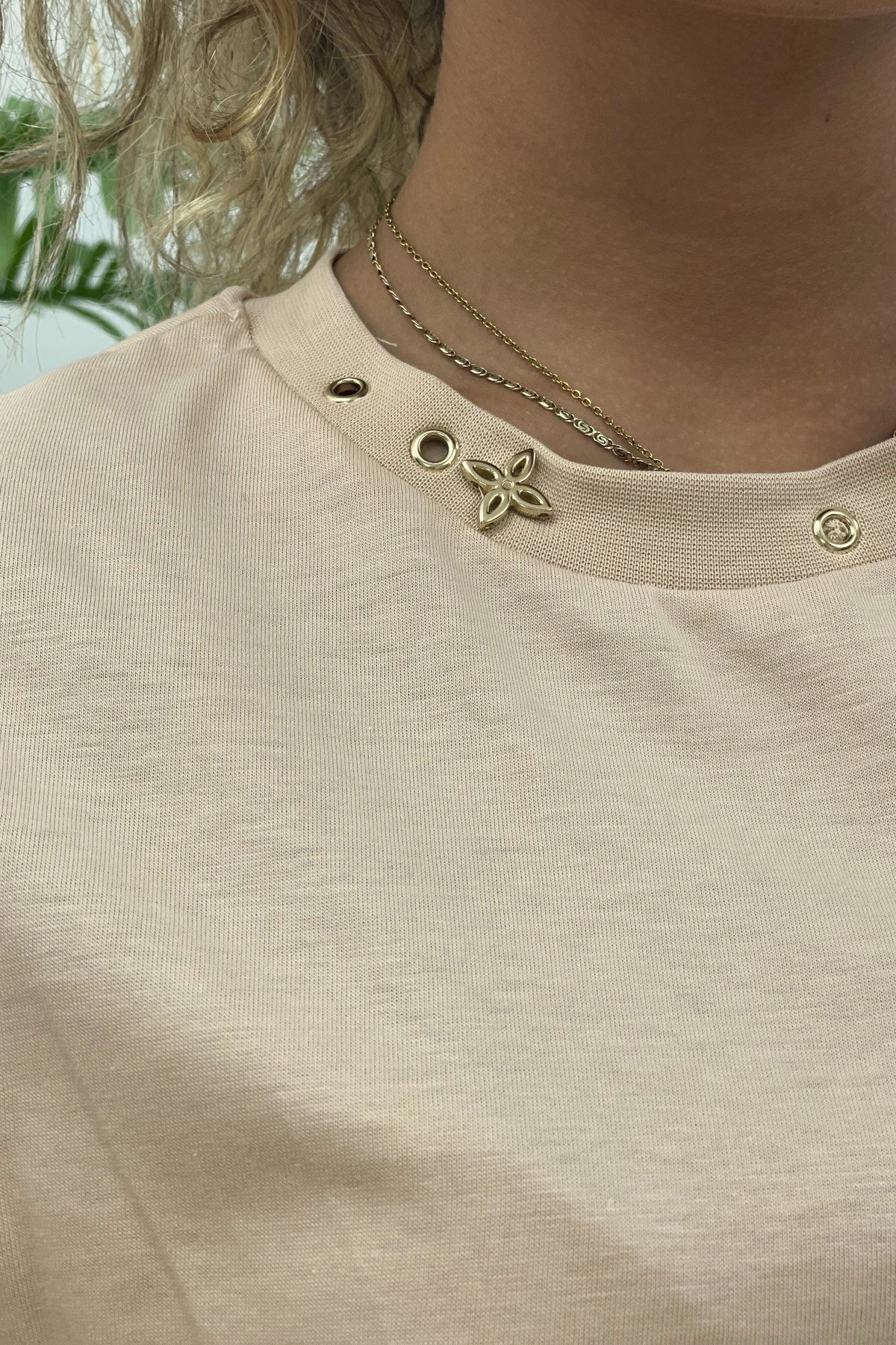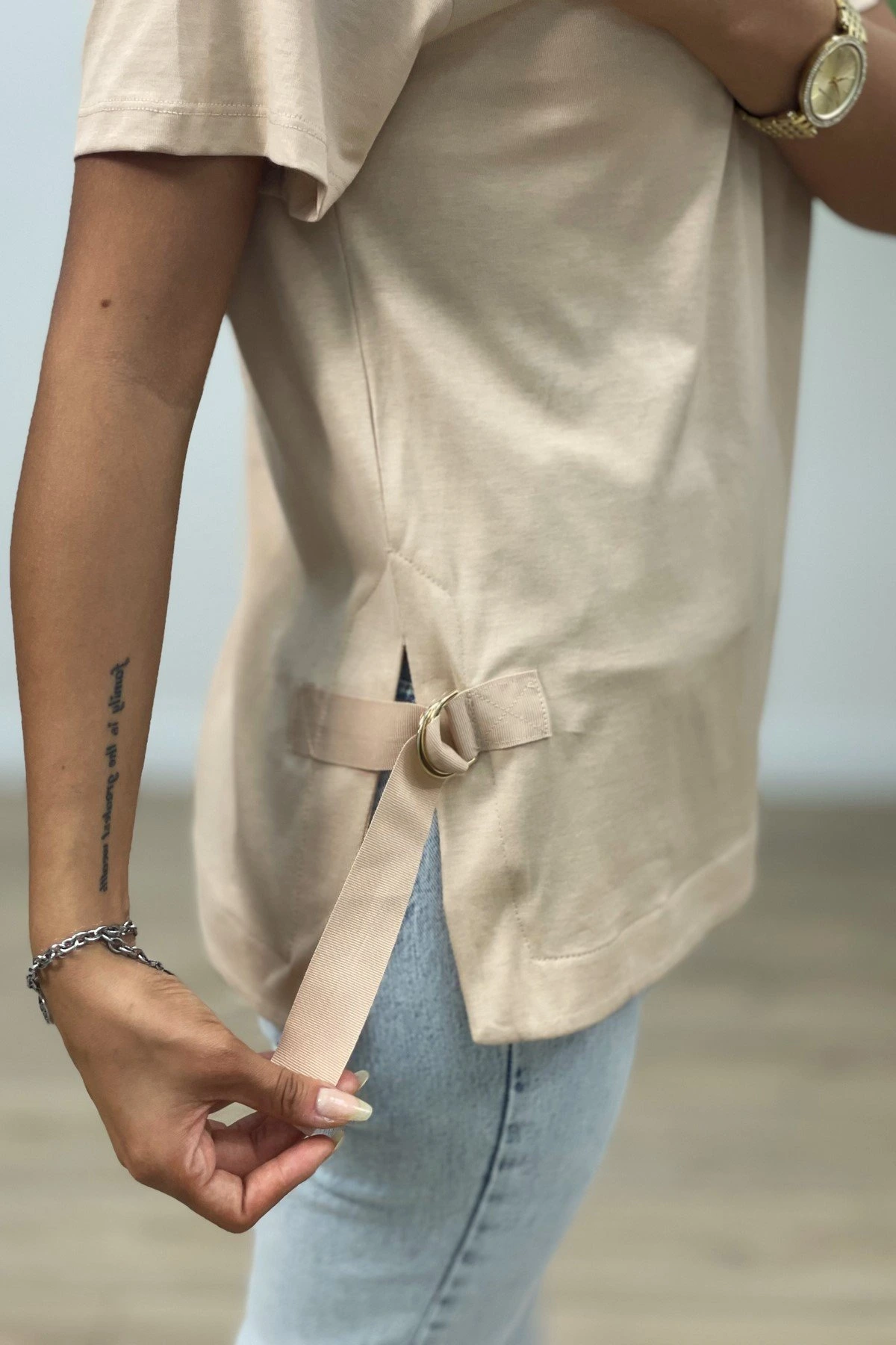 YAKA AKSESUARLI YAN ŞERİT TİŞÖRT – BEJ