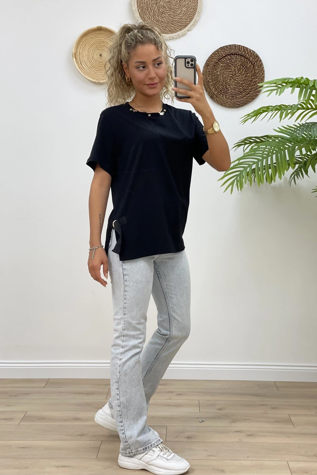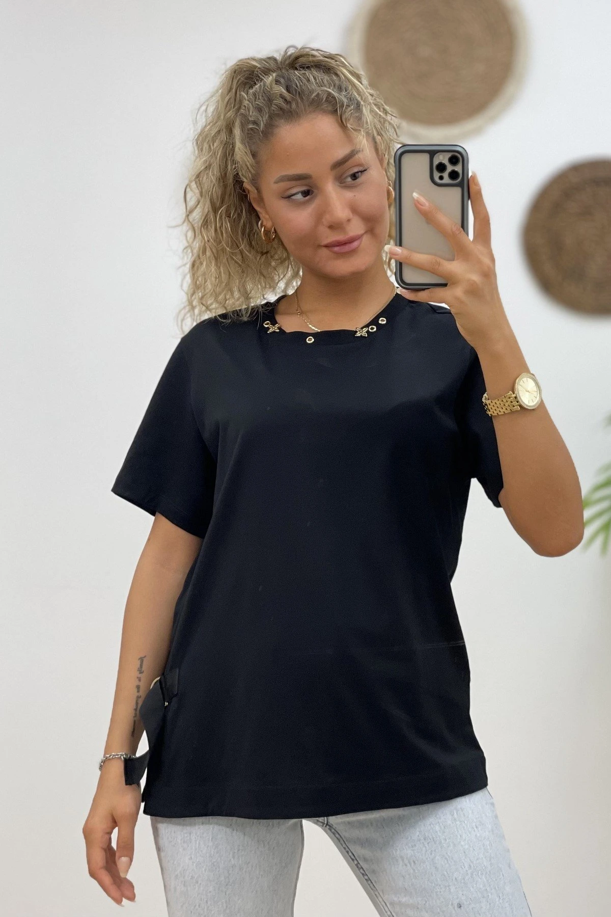 YAKA AKSESUARLI YAN ŞERİT TİŞÖRT – SİYAH