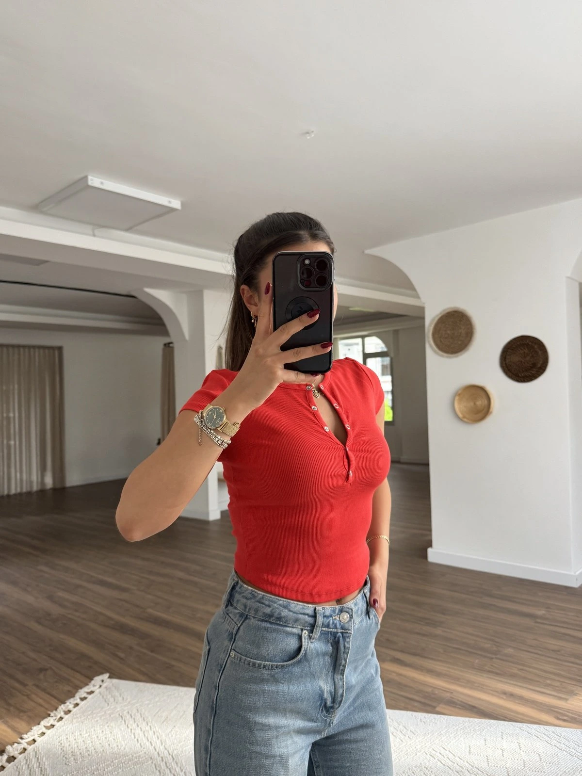 YAKA ÇITÇITLI ÖN OVAL KISA TİŞÖRT – KOYU KIRMIZI
