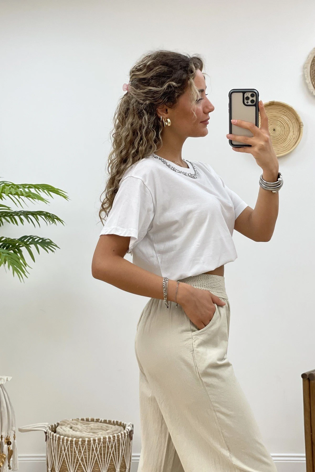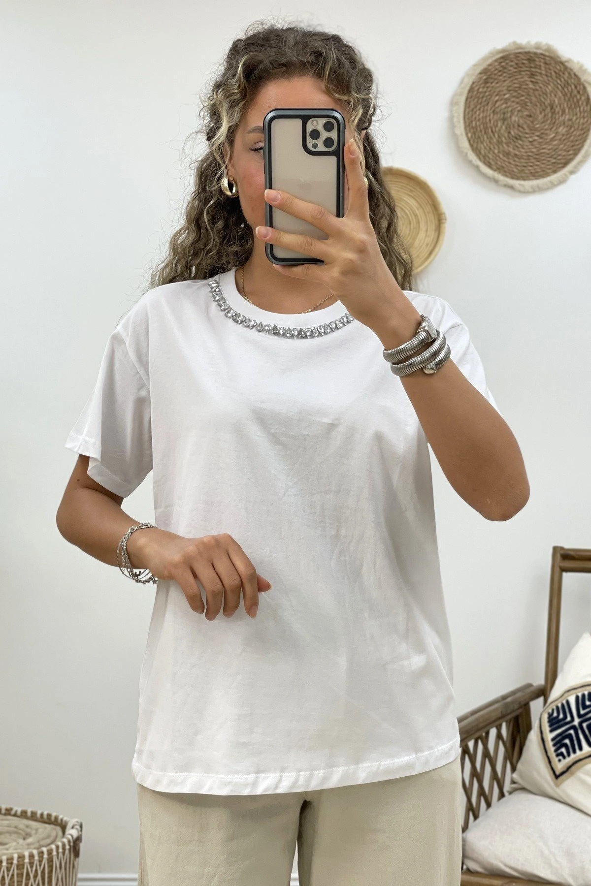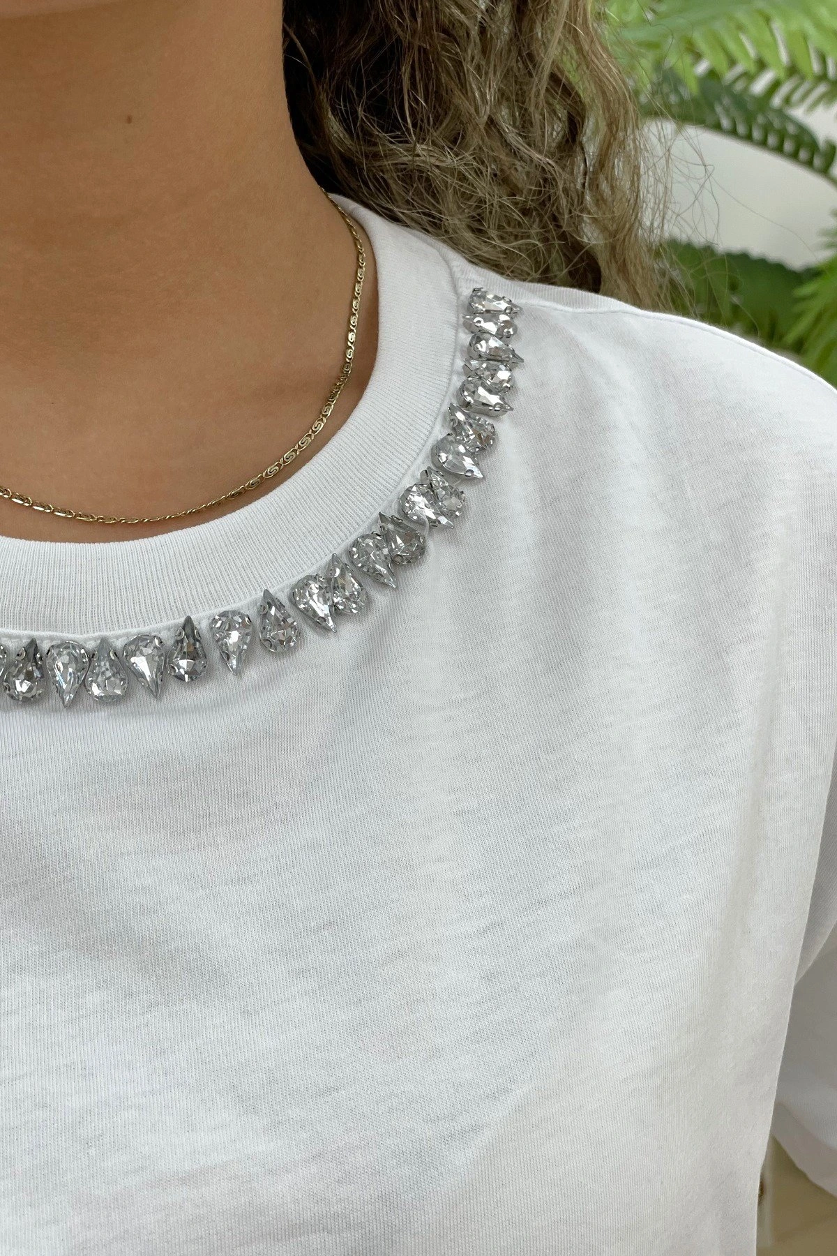 YAKA DAMLA TAŞ TİŞÖRT – BEYAZ