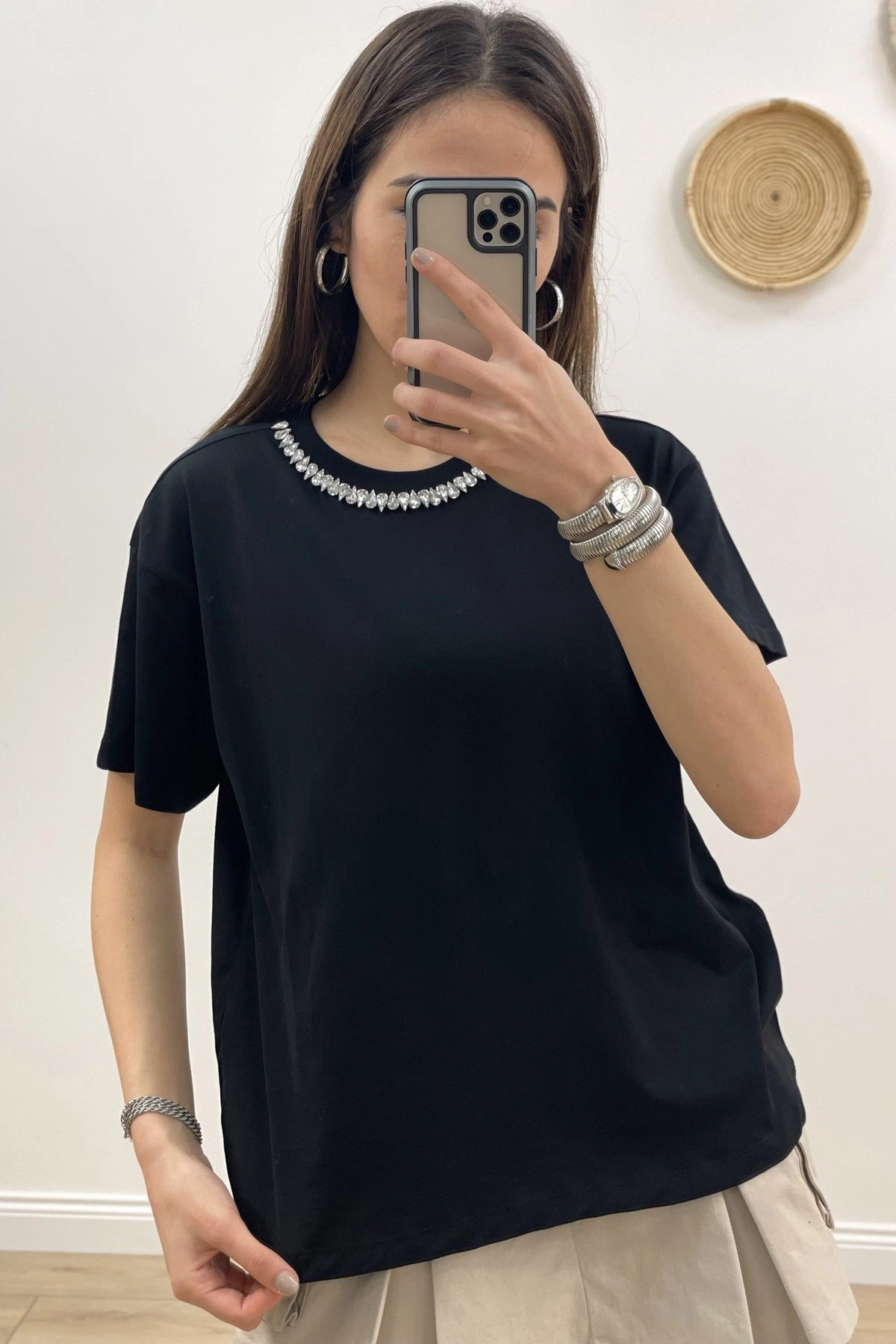 YAKA DAMLA TAŞ TİŞÖRT – SİYAH