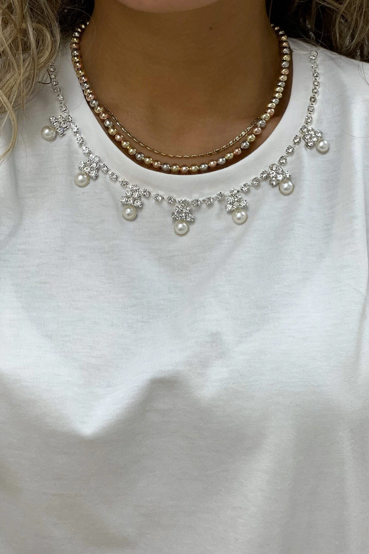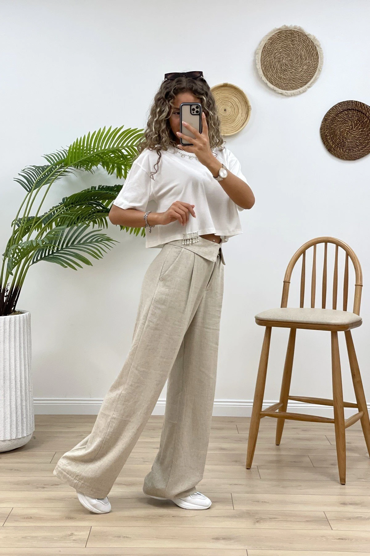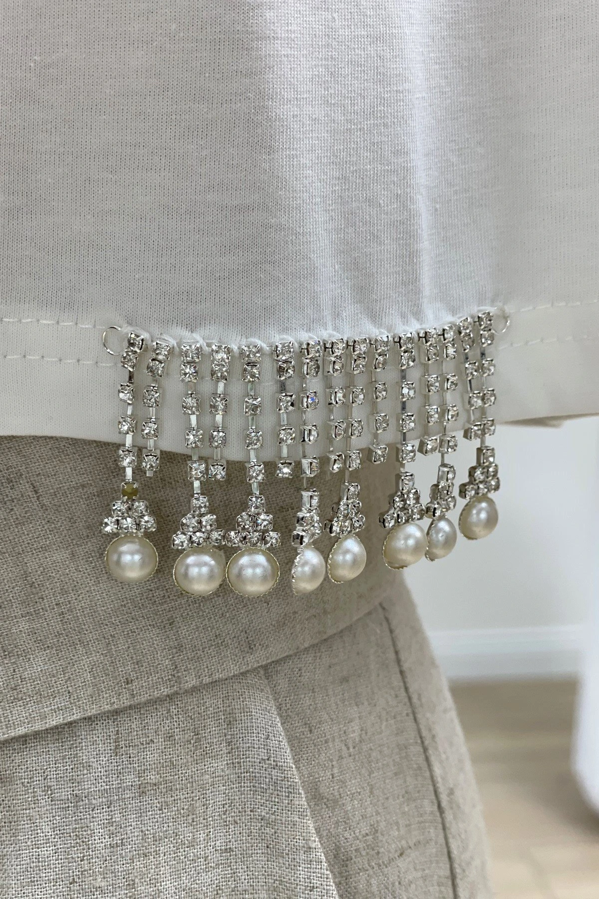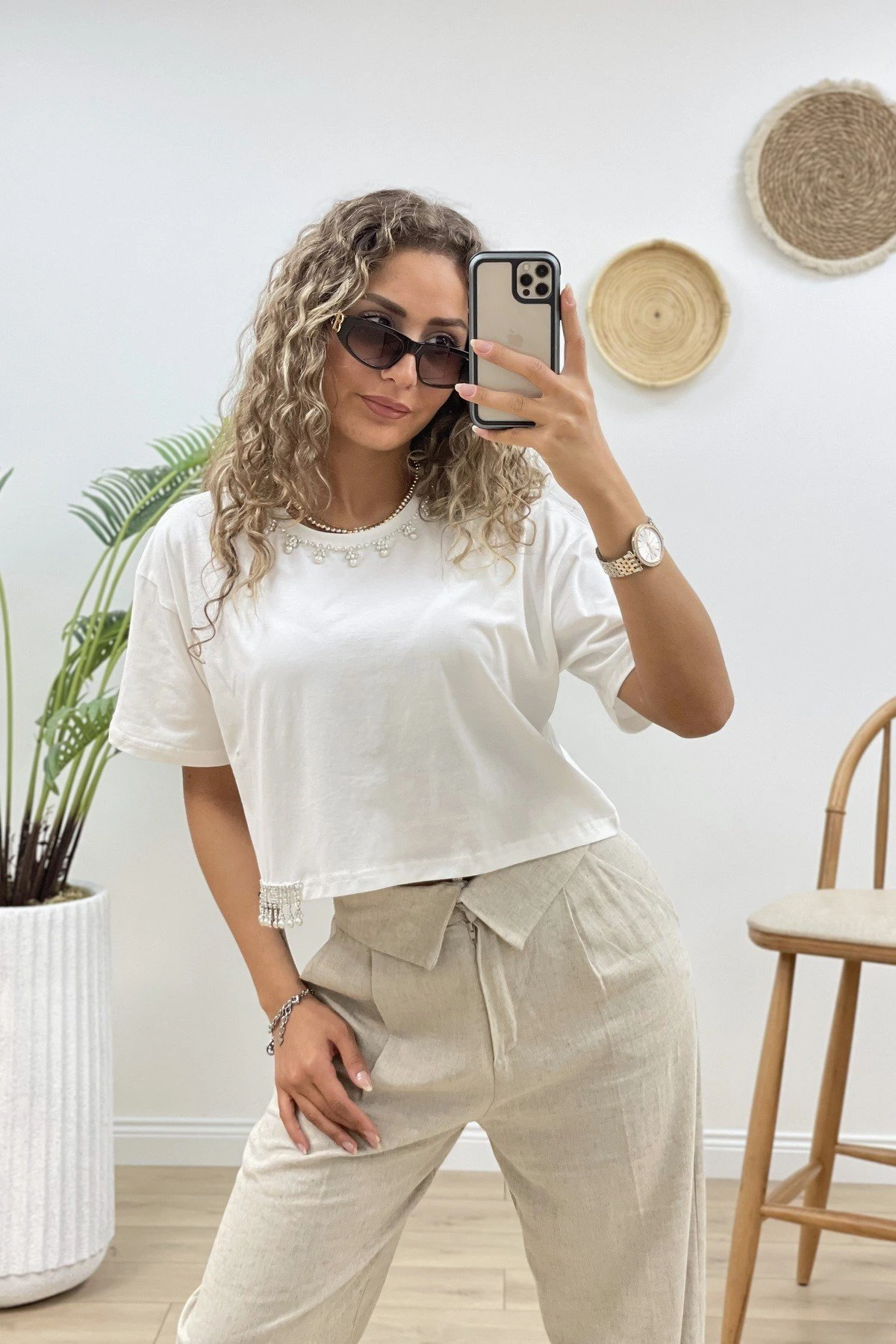 YAKA VE ETEK UCU TAŞLI CROP TİŞÖRT – EKRU