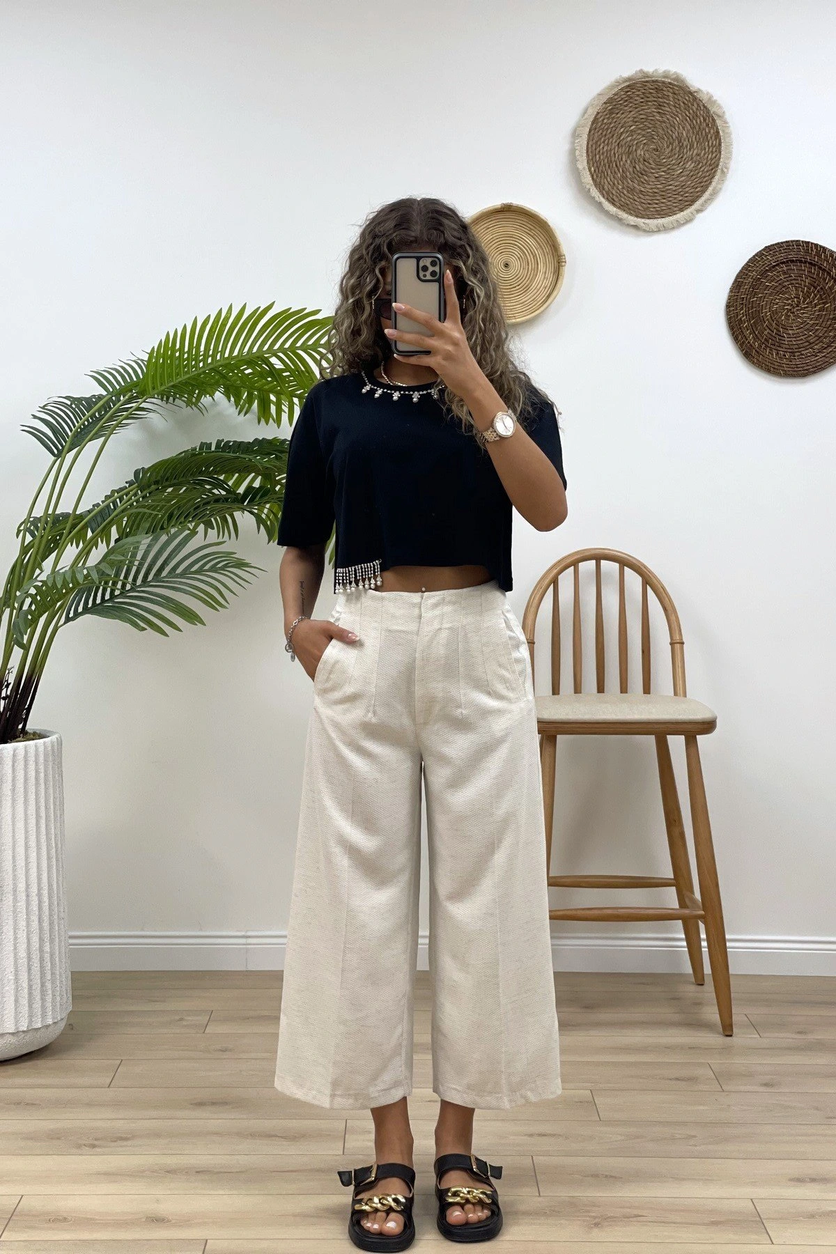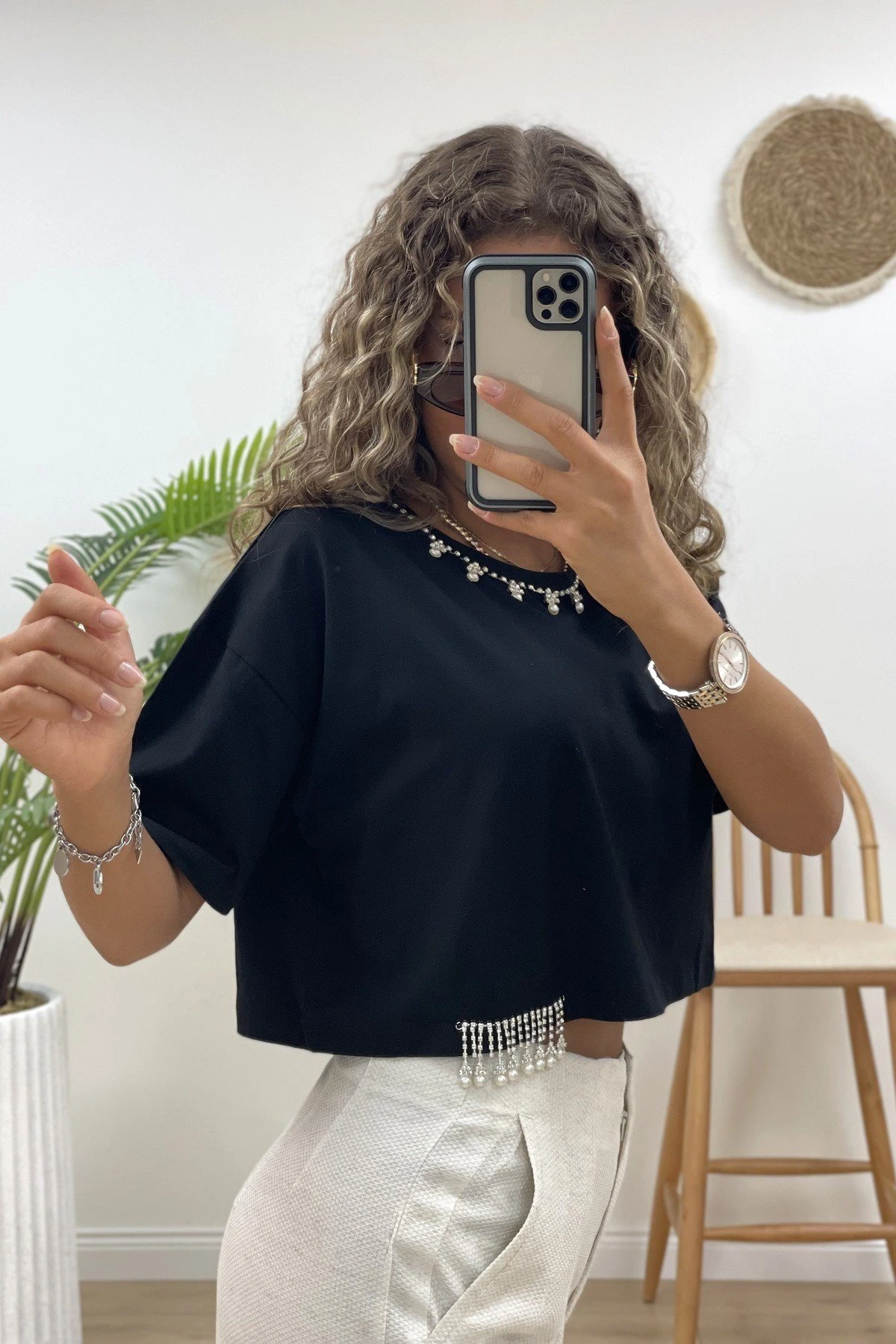 YAKA VE ETEK UCU TAŞLI CROP TİŞÖRT – SİYAH