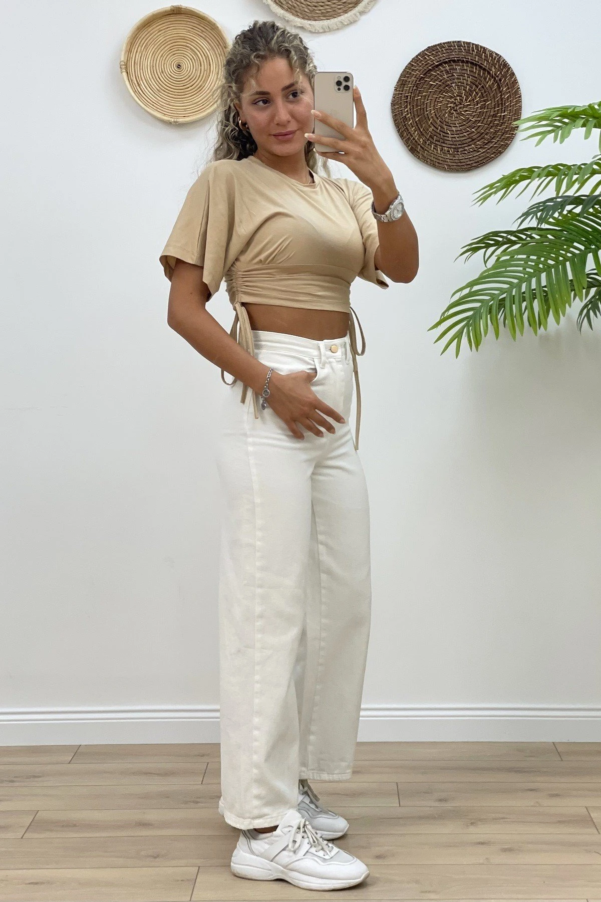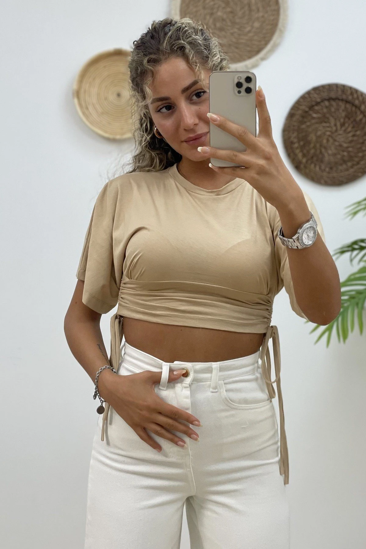 YAN İP BÜZGÜ YARASA KOL CROP TİŞÖRT – BEJ
