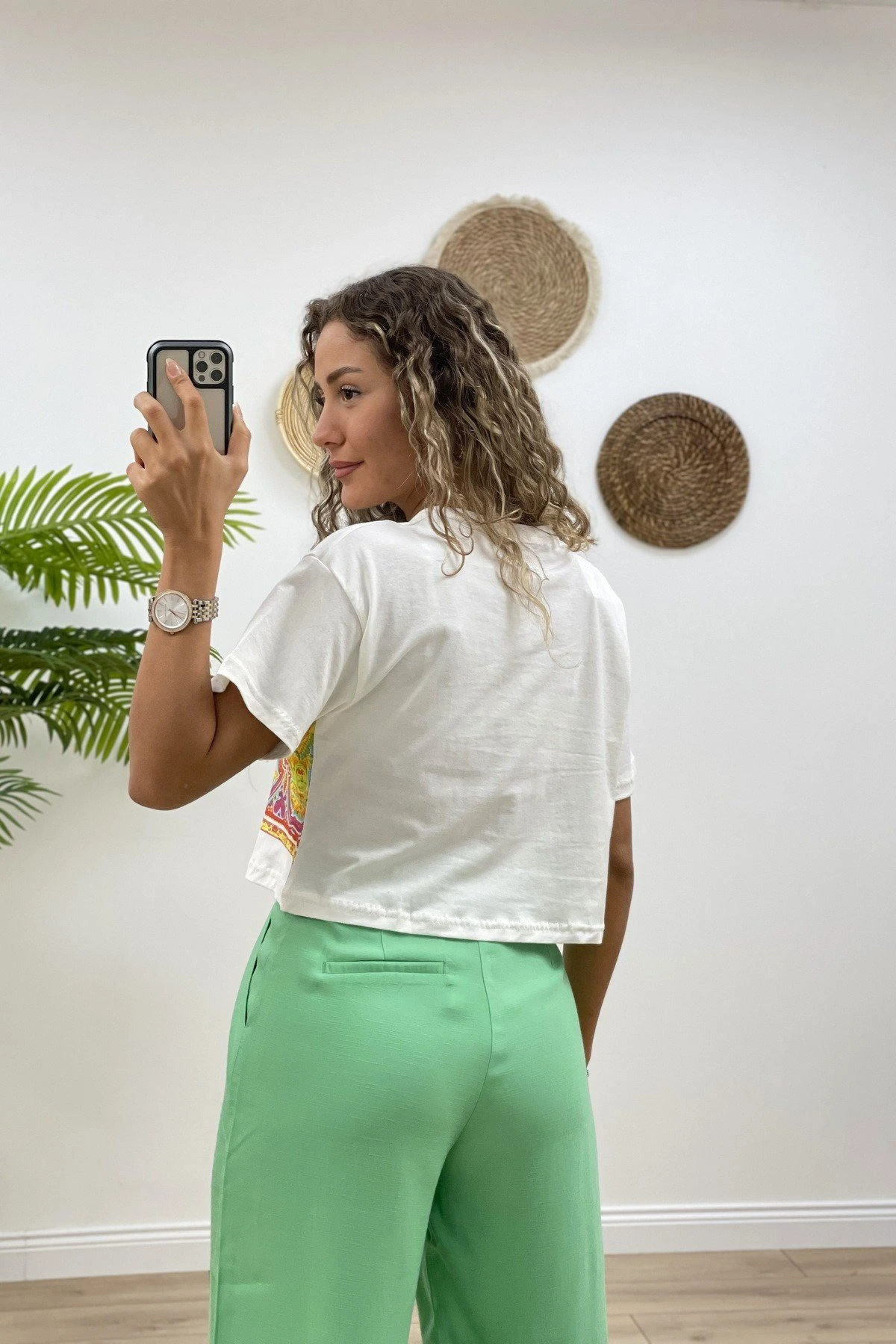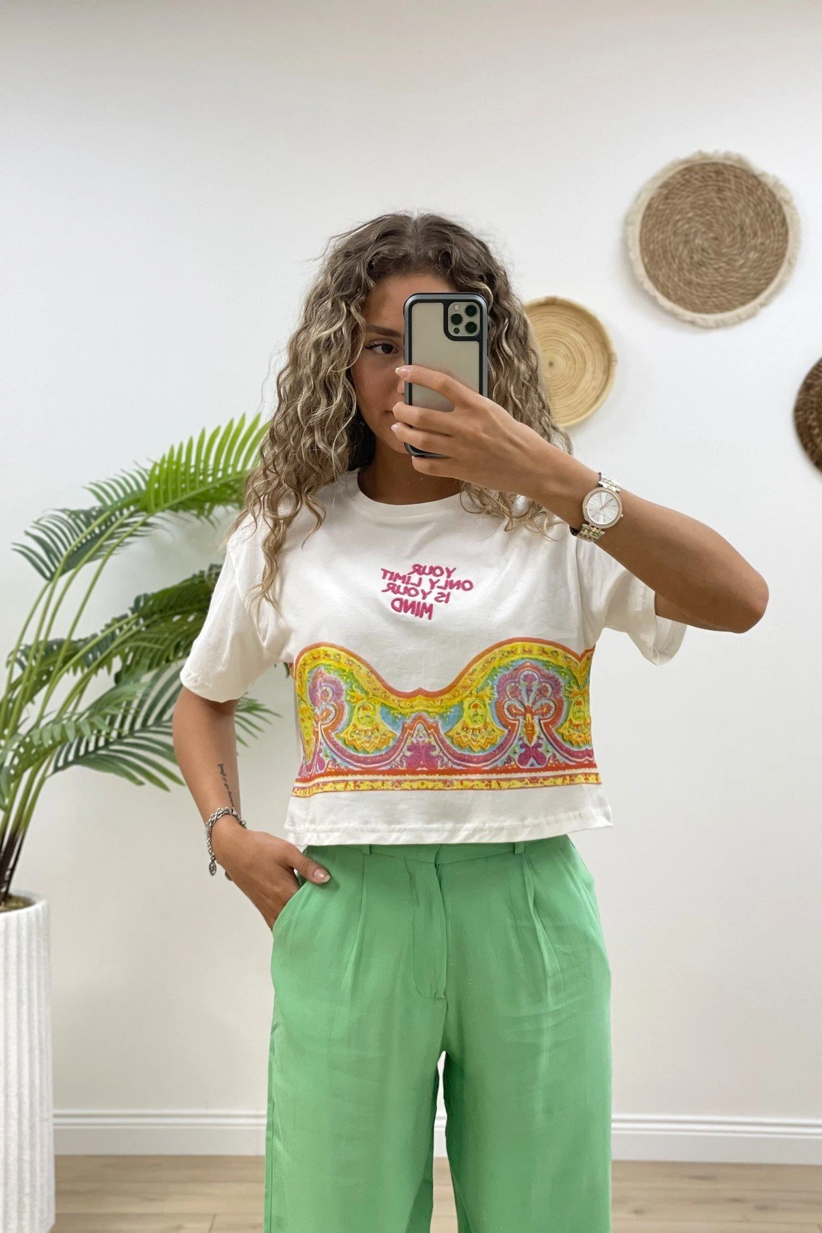 YAZI NAKIŞ RENKLİ DESEN SALAŞ CROP – EKRU
