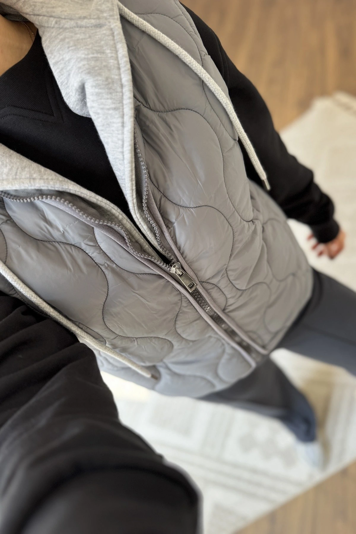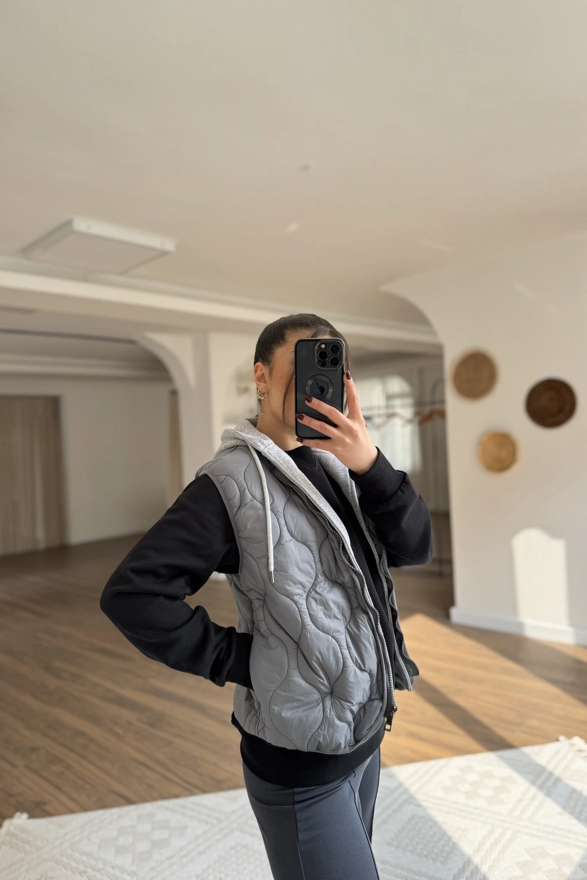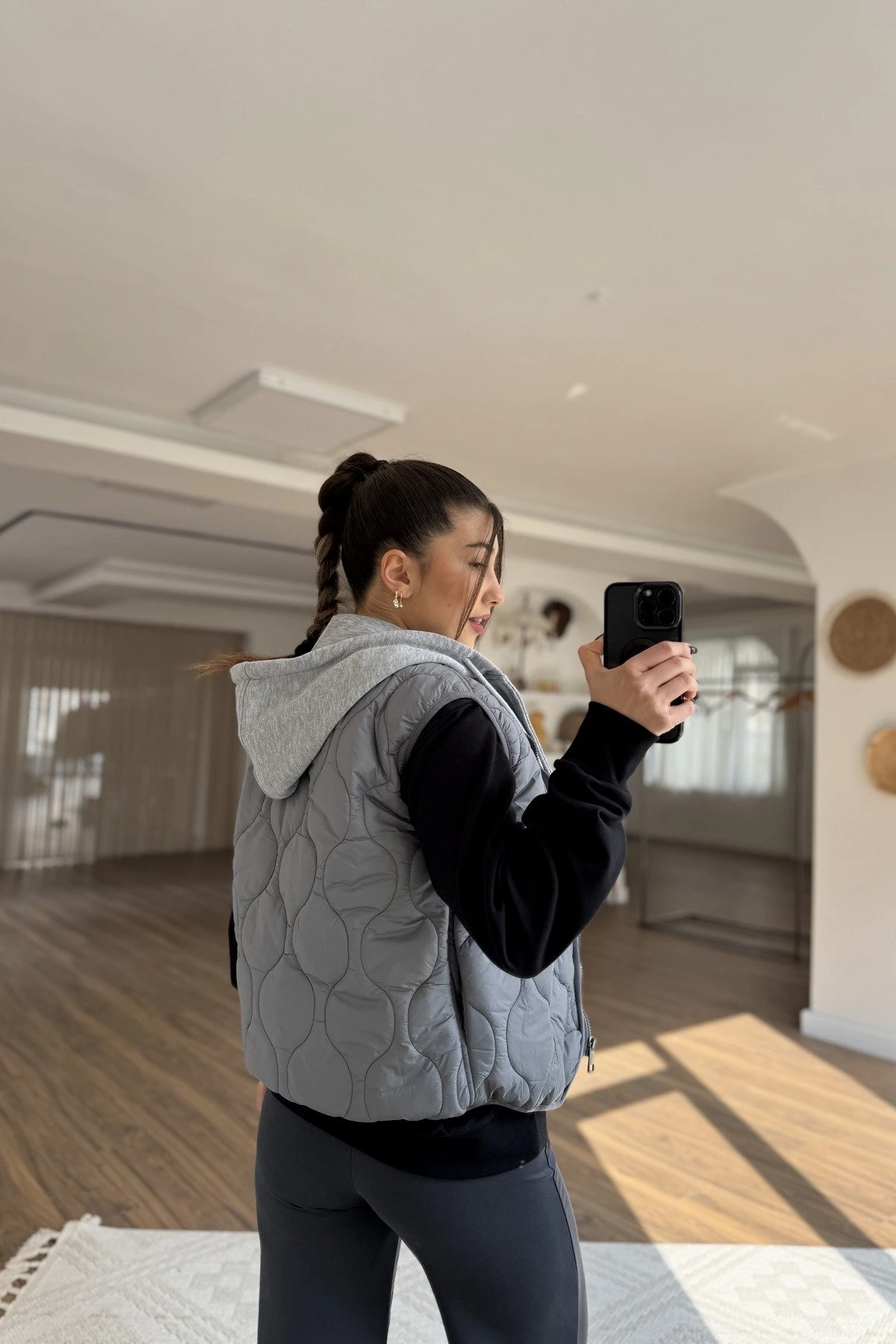 ÇIKARILABİLİR KAPÜŞONLU KAPİTONE PAMUK YELEK – GRİ