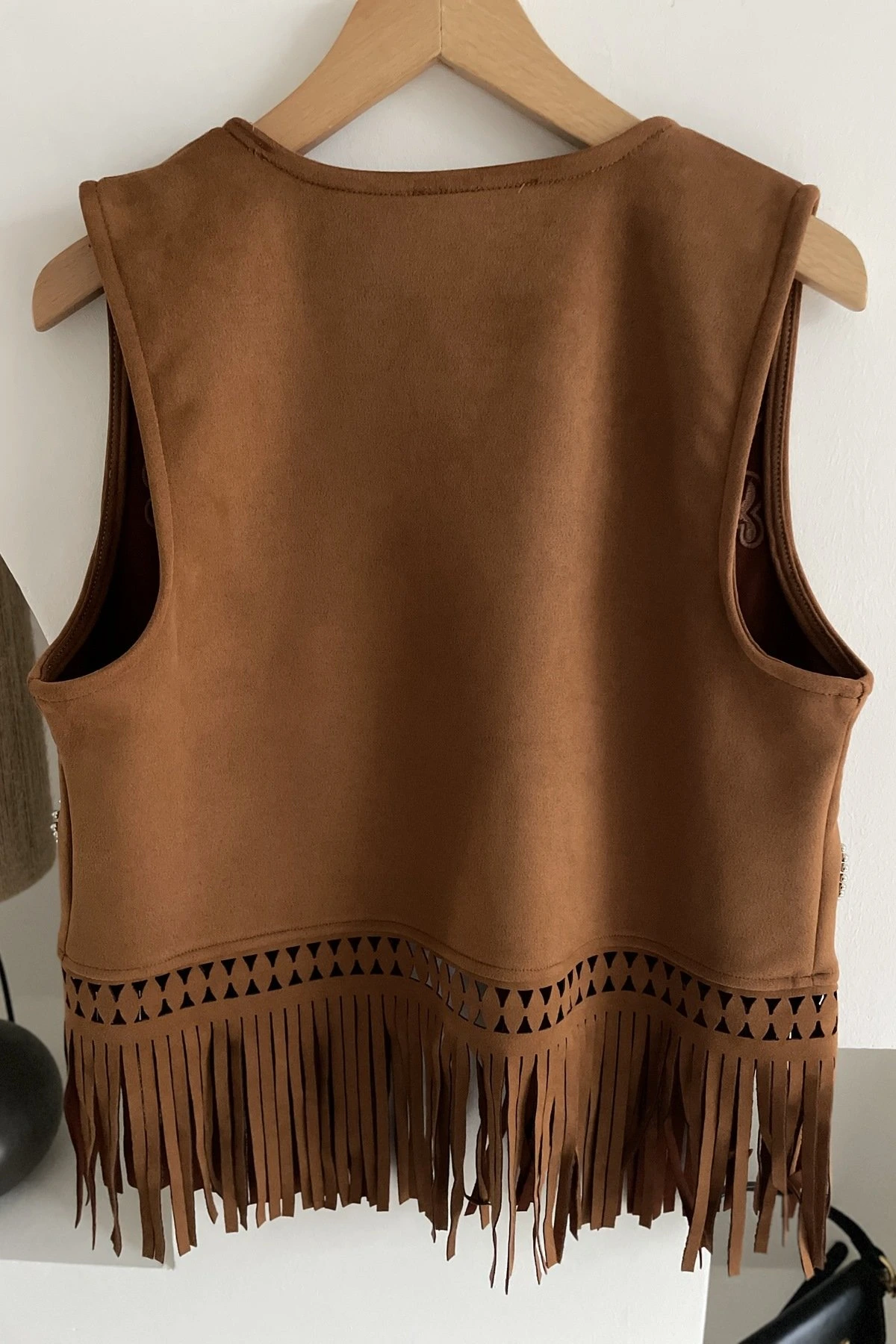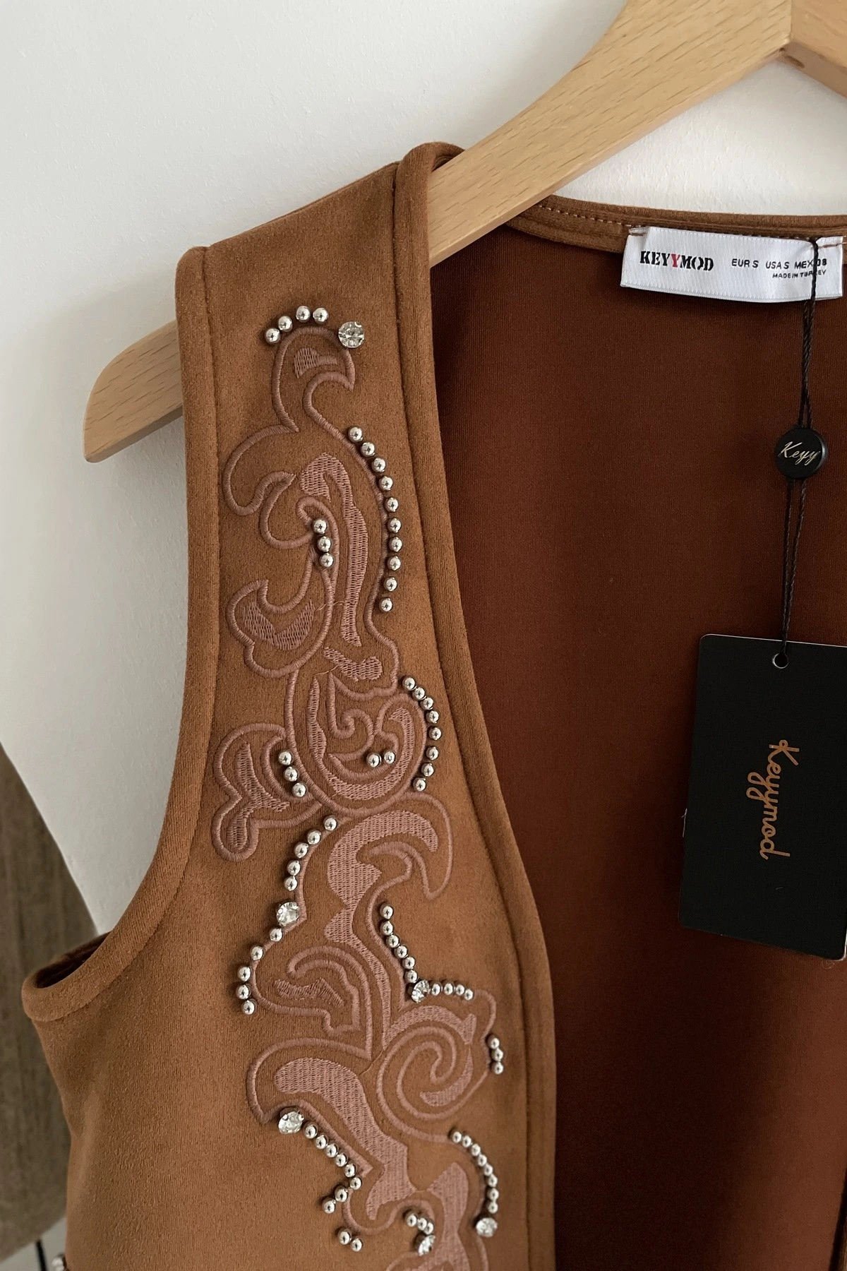 ETEĞİ PÜSKÜL BONCUK VE TAŞ ÇAKIM SÜET YELEK – TABA