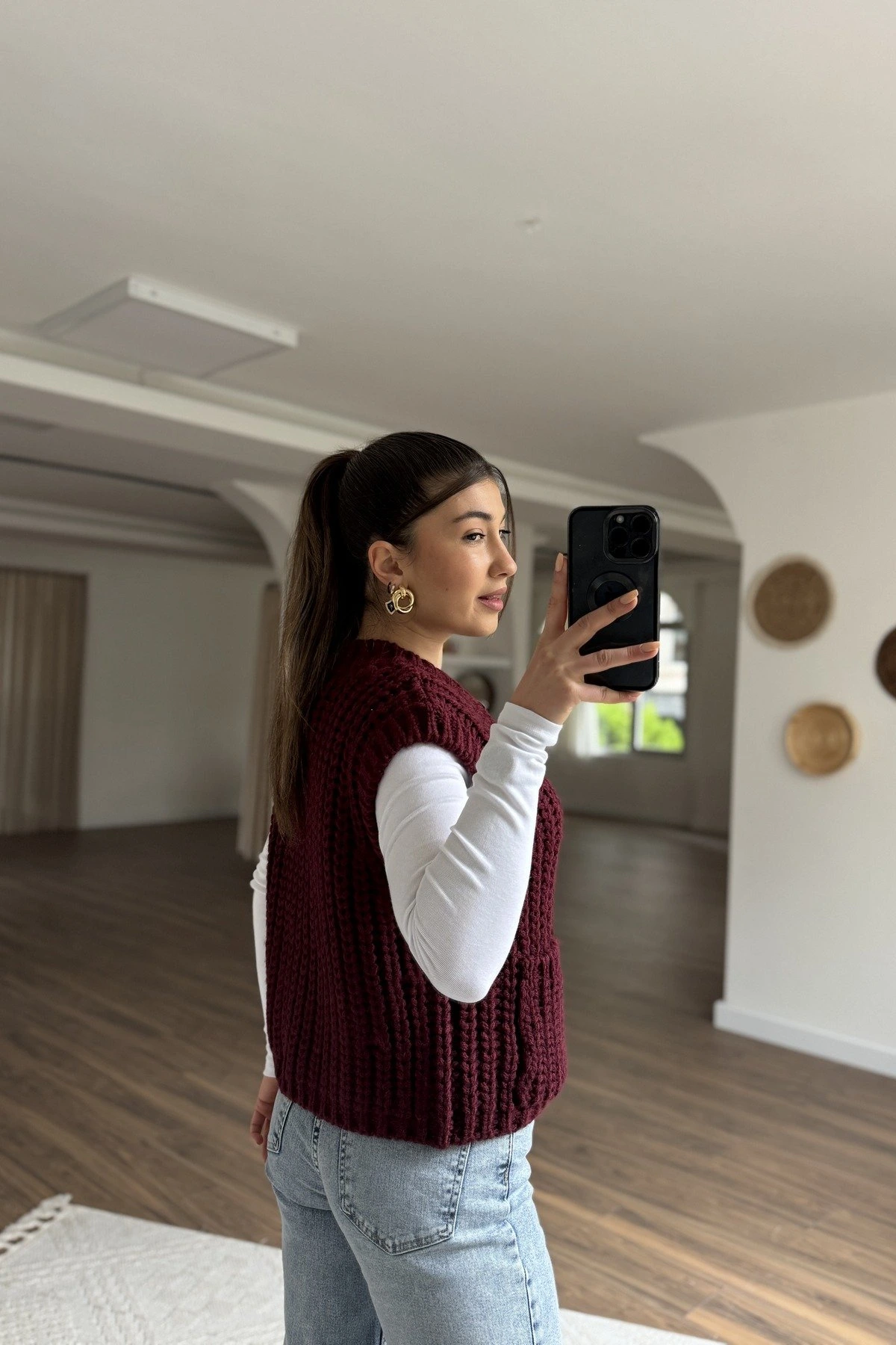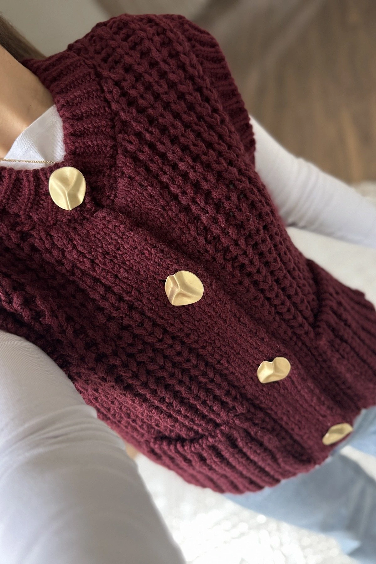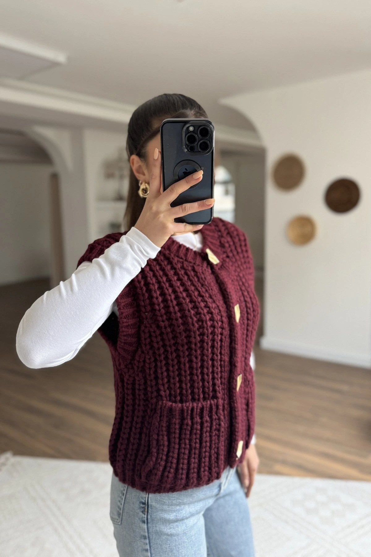 KALIN ÖRGÜ BÜYÜK AKSESUAR DÜĞME CEPLİ YELEK – BORDO