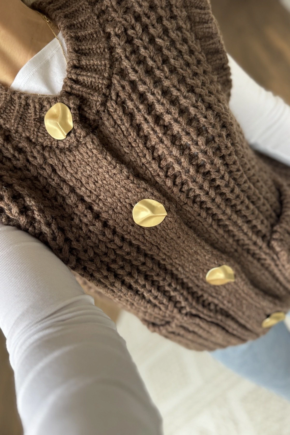 KALIN ÖRGÜ BÜYÜK AKSESUAR DÜĞME CEPLİ YELEK – KAHVE
