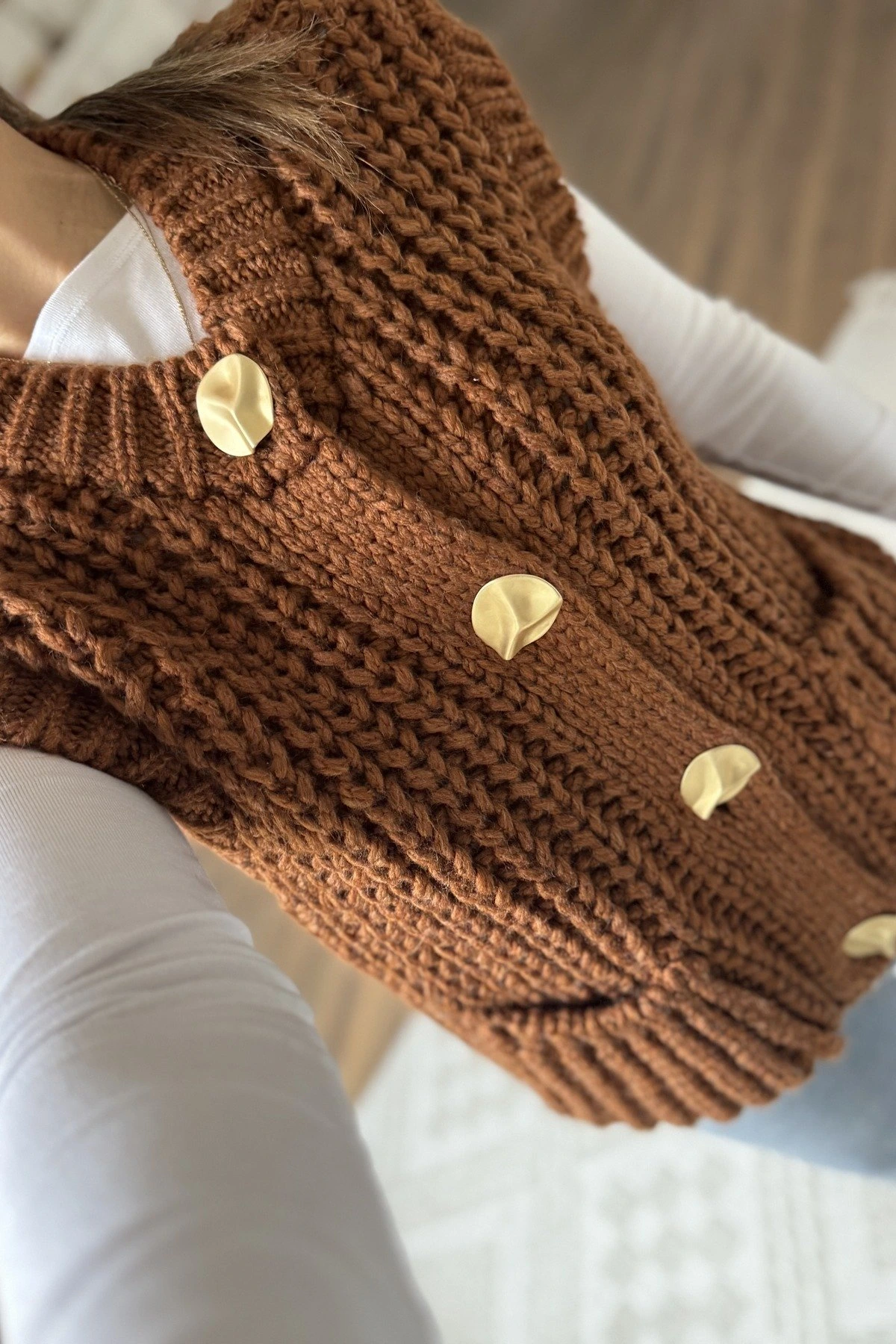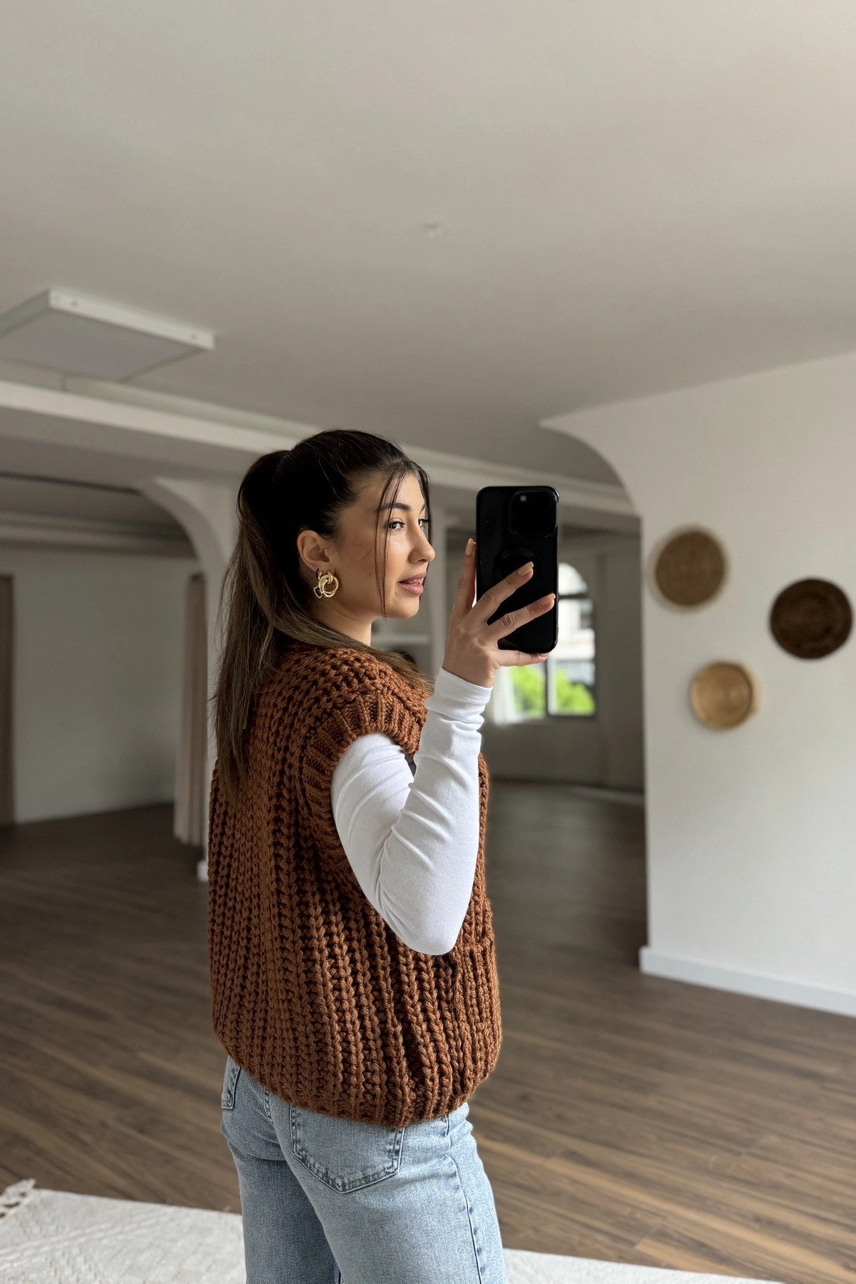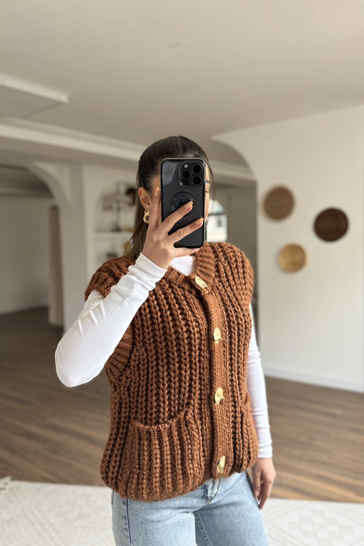 KALIN ÖRGÜ BÜYÜK AKSESUAR DÜĞME CEPLİ YELEK – KARAMEL