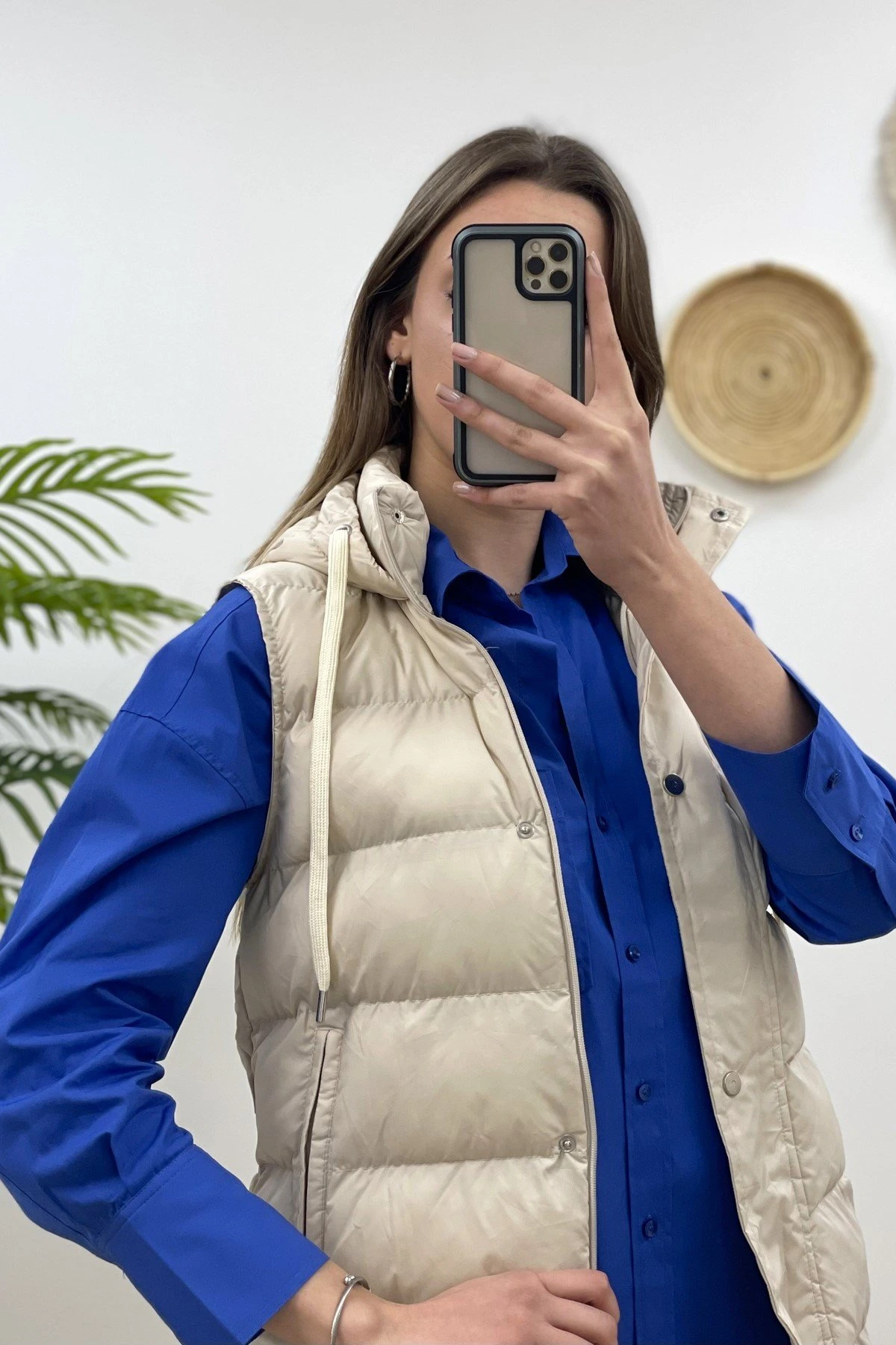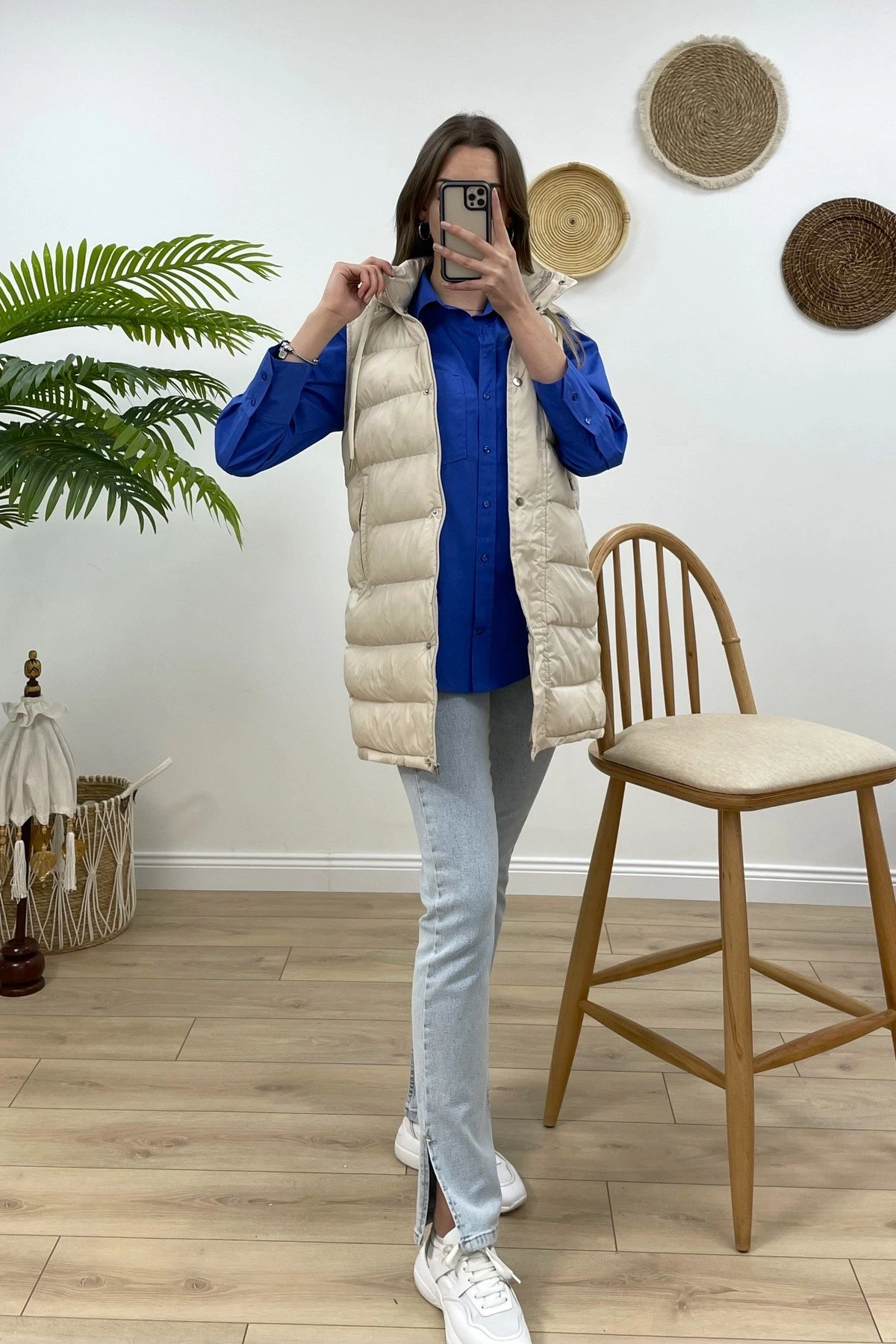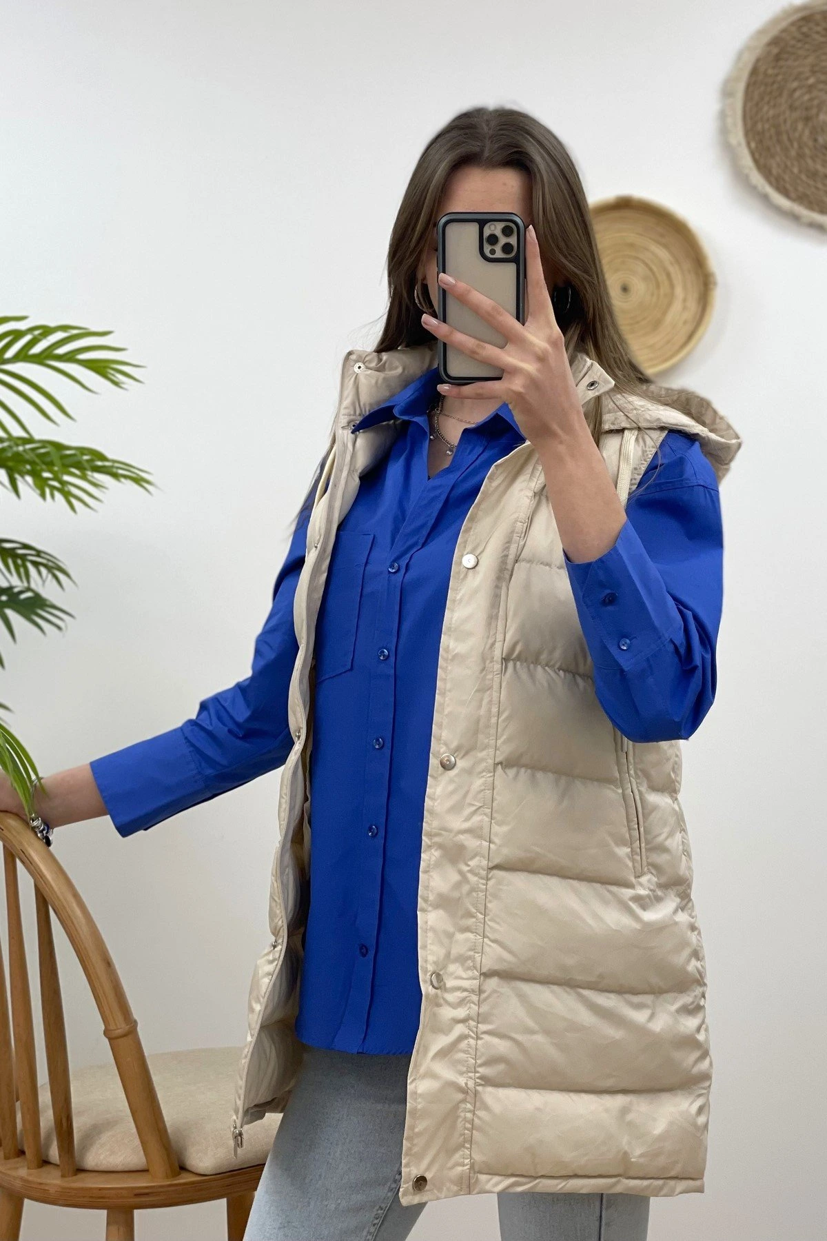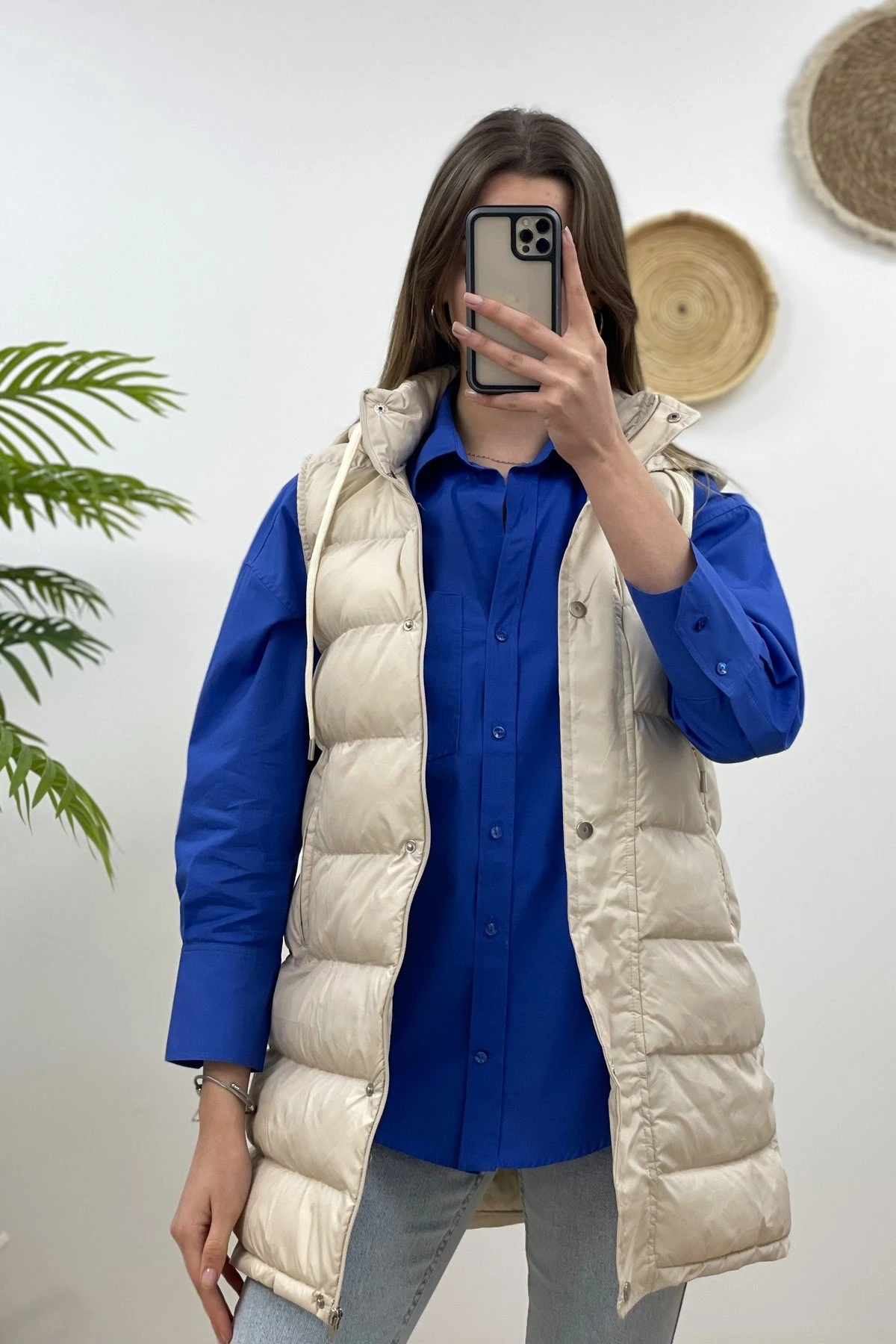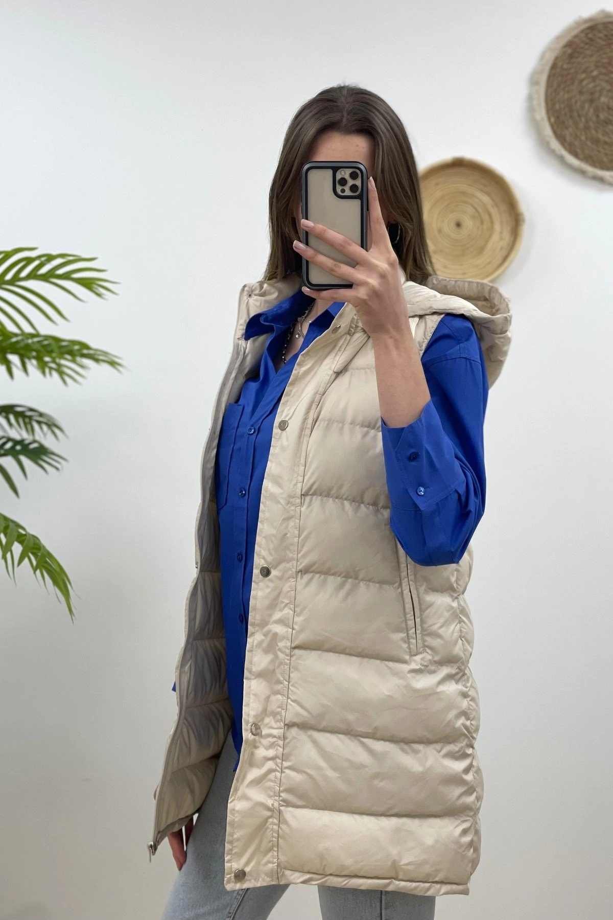 KAPÜŞONLU UZUN ŞİŞME YELEK – TAŞ