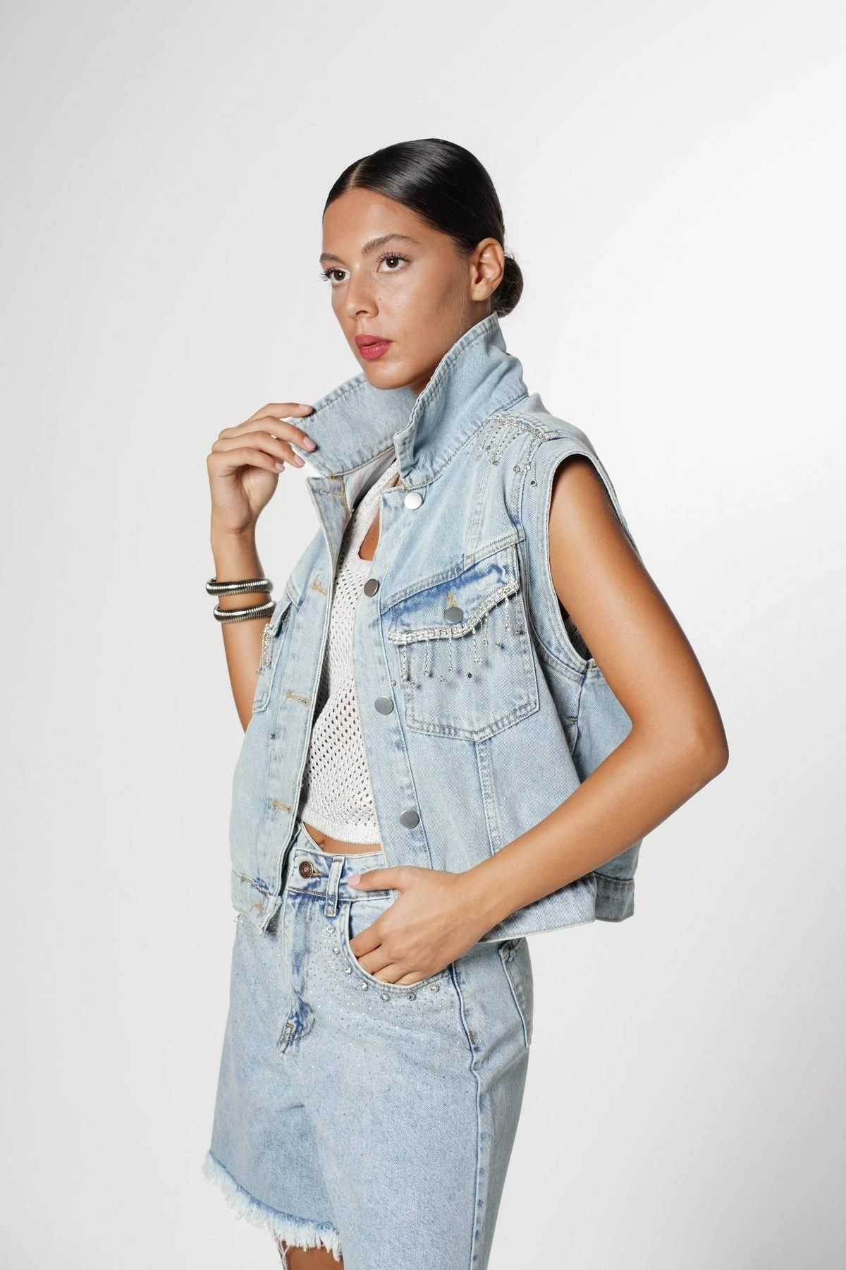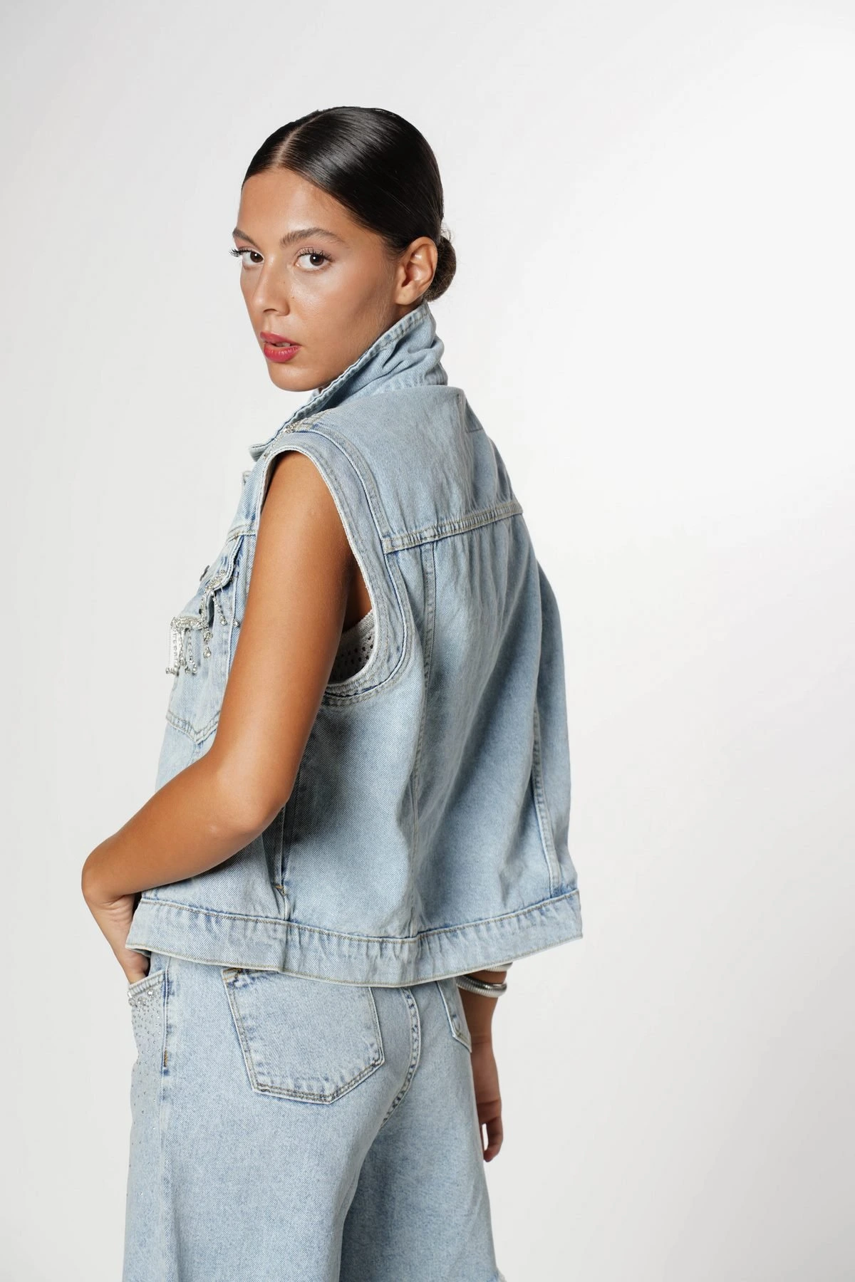 OMUZ VE CEP SARKMA TAŞ JEAN YELEK – AÇIK MAVİ