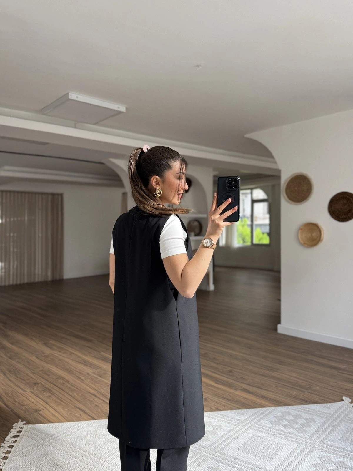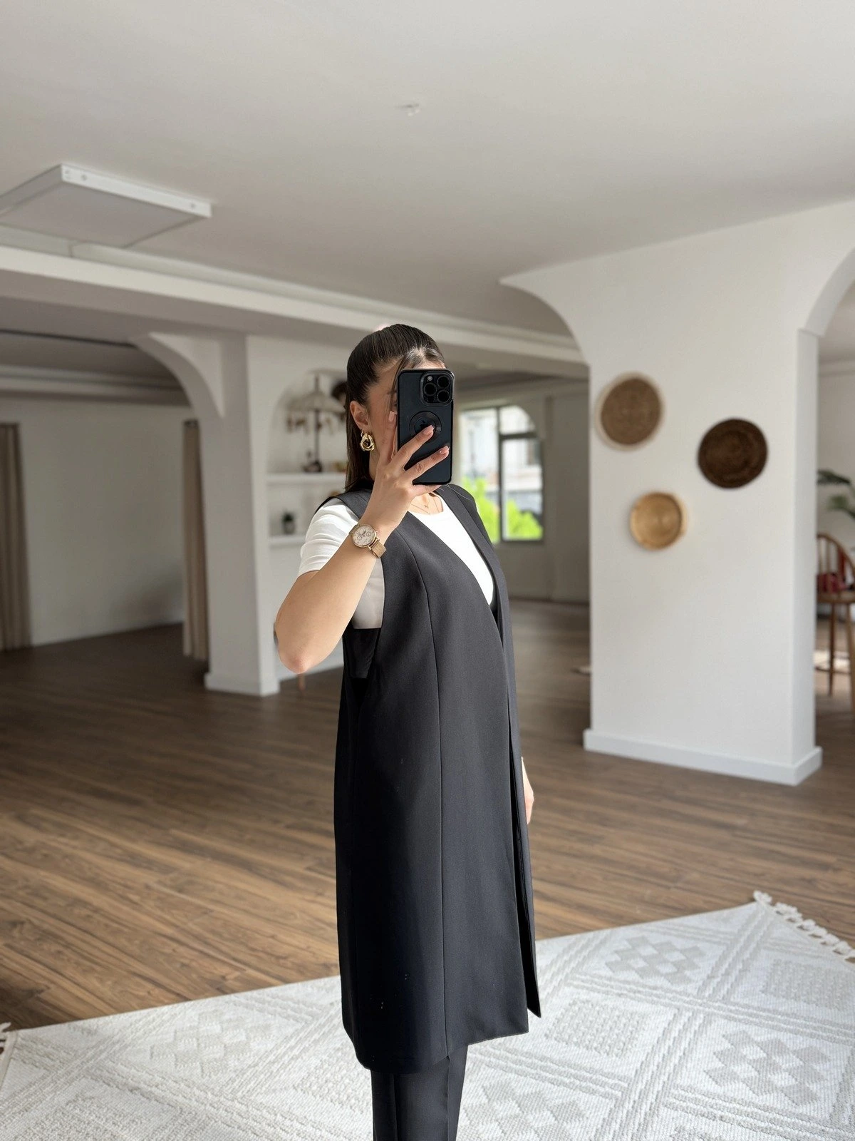 YAN PENCERE DETAY V YAKA UZUN VİSKON KARIŞIM YELEK – SİYAH