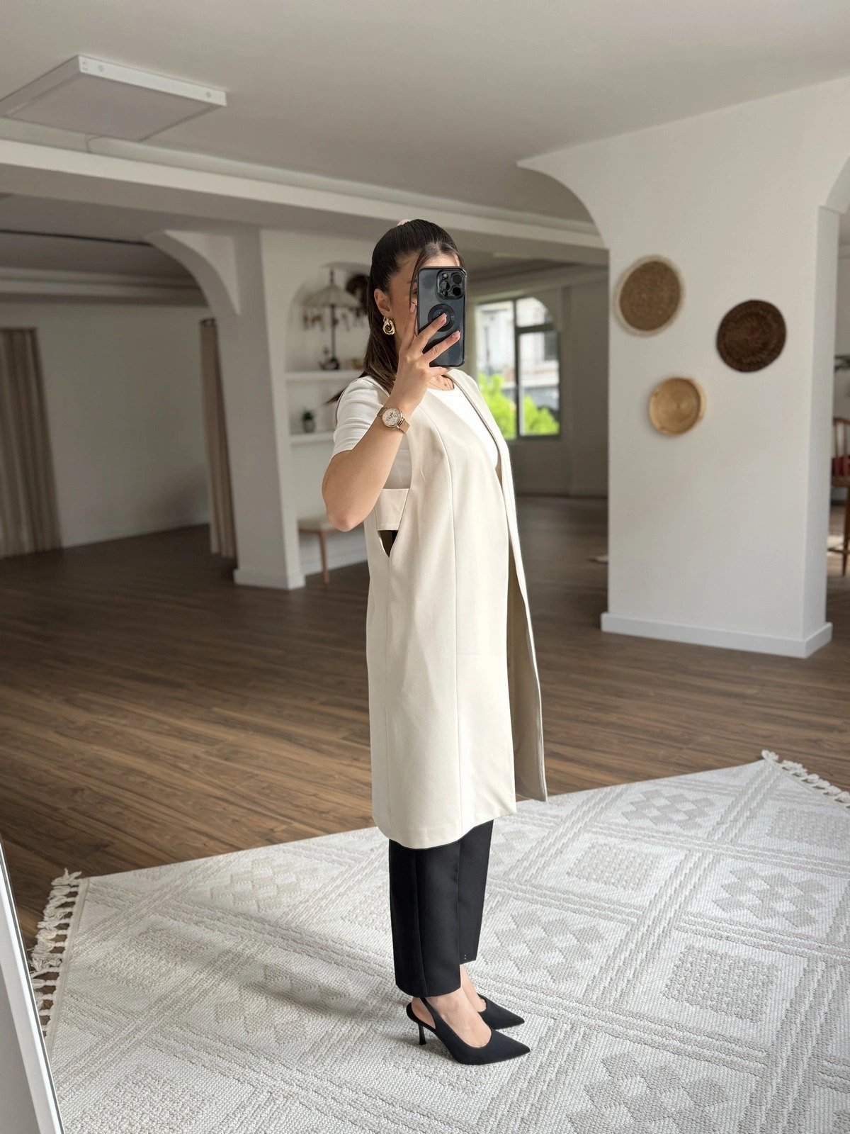 YAN PENCERE DETAY V YAKA UZUN VİSKON KARIŞIM YELEK – TAŞ