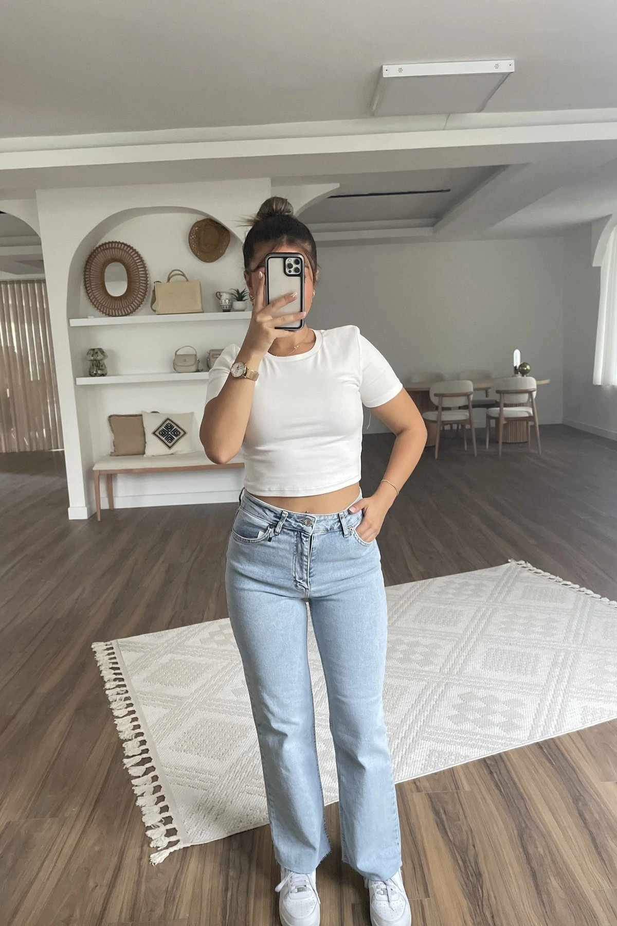 FLARE LİKRALI KESİK PAÇA JEAN – BUZ MAVİ