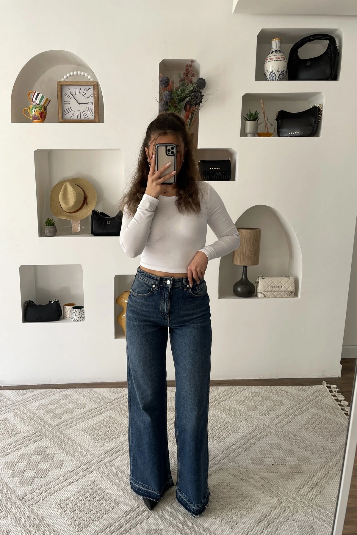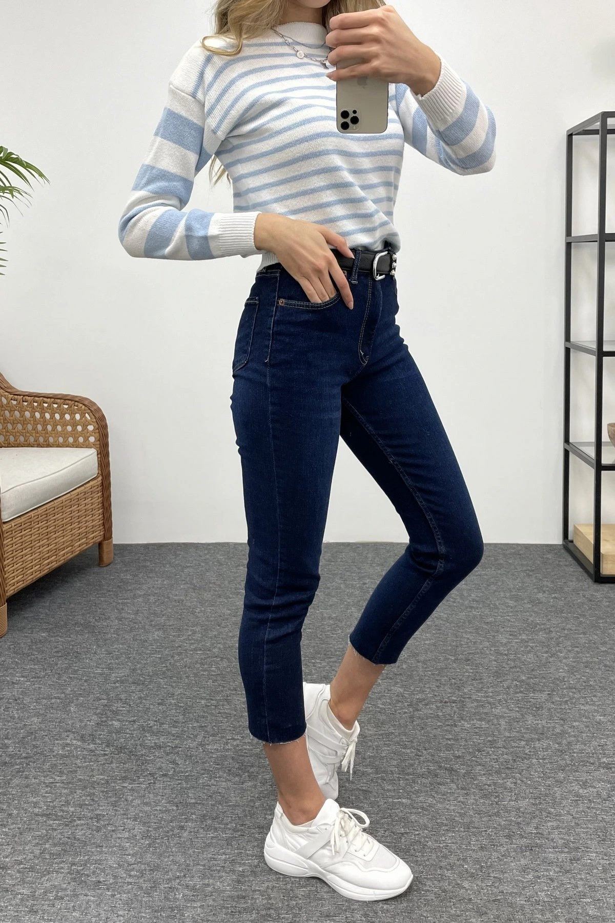 YÜKSEK BEL LİKRALI STRAIGHT JEAN – KOYU MAVİ