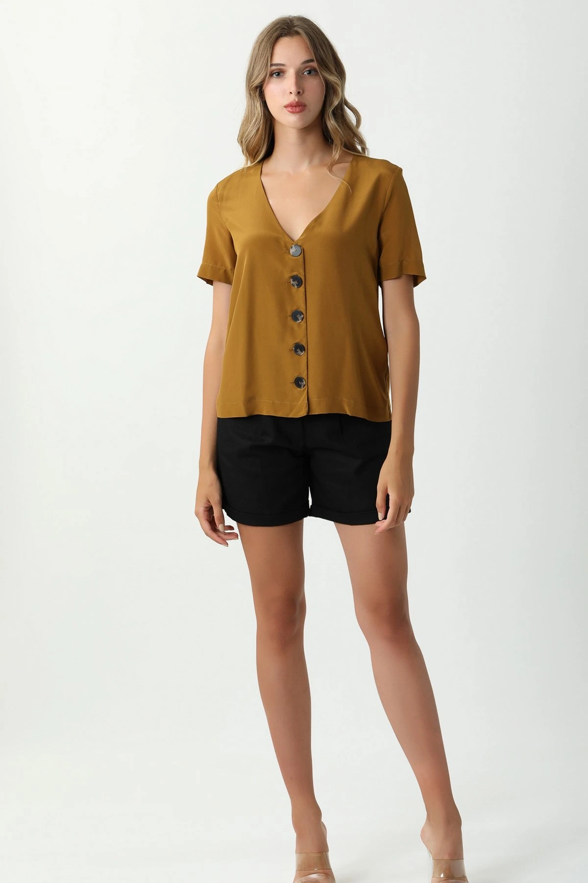 HALLHUBER DÜĞMELİ V YAKA İPEK BLUZ – YAĞ YEŞİL