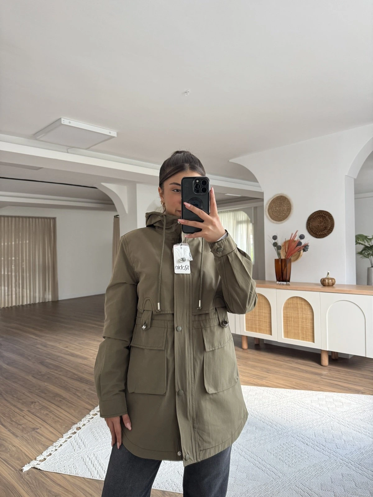 KAPÜŞONLU BEL BÜZGÜ CEP DETAY VİSKON KISA TRENÇ – HAKİ
