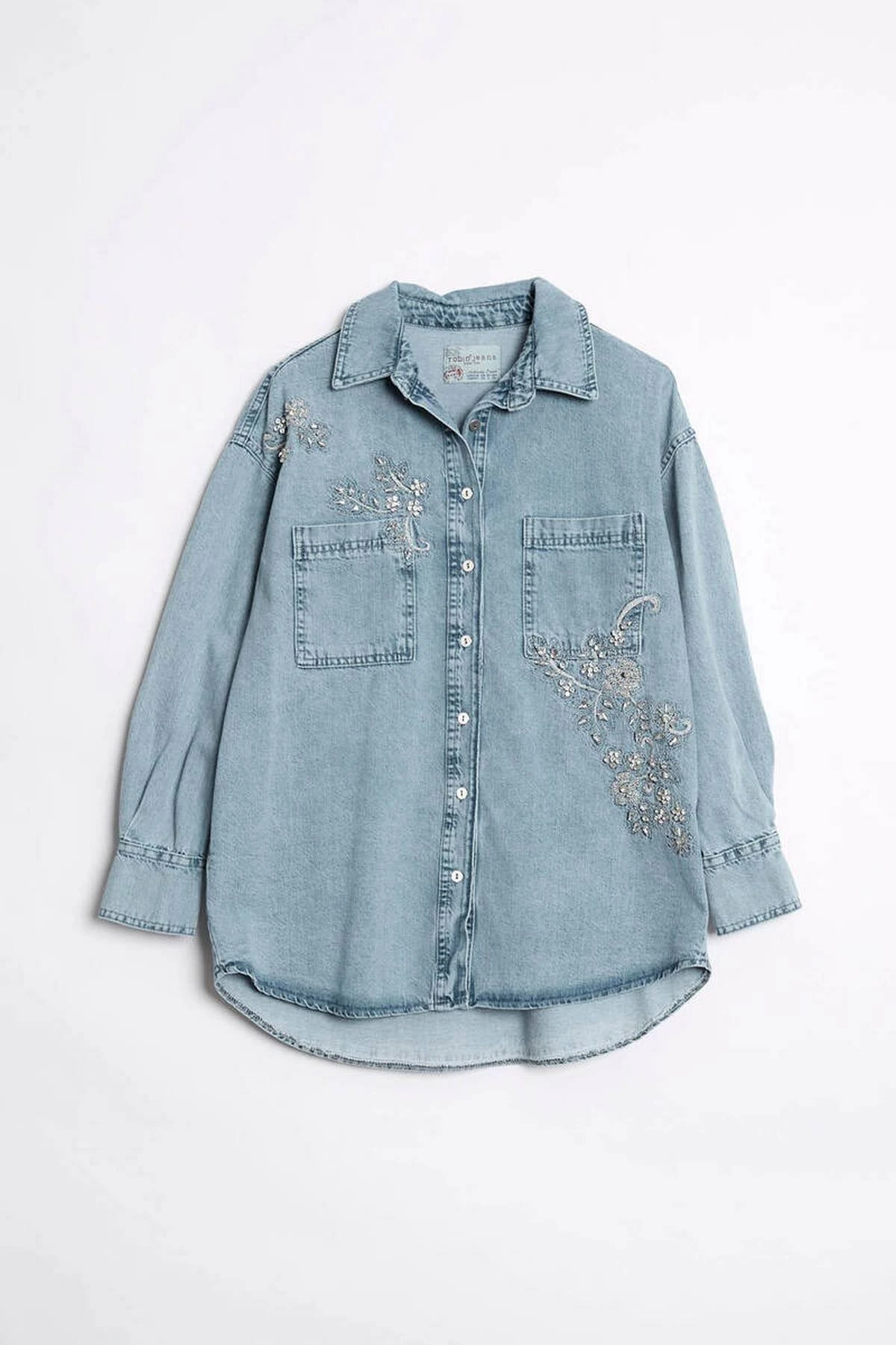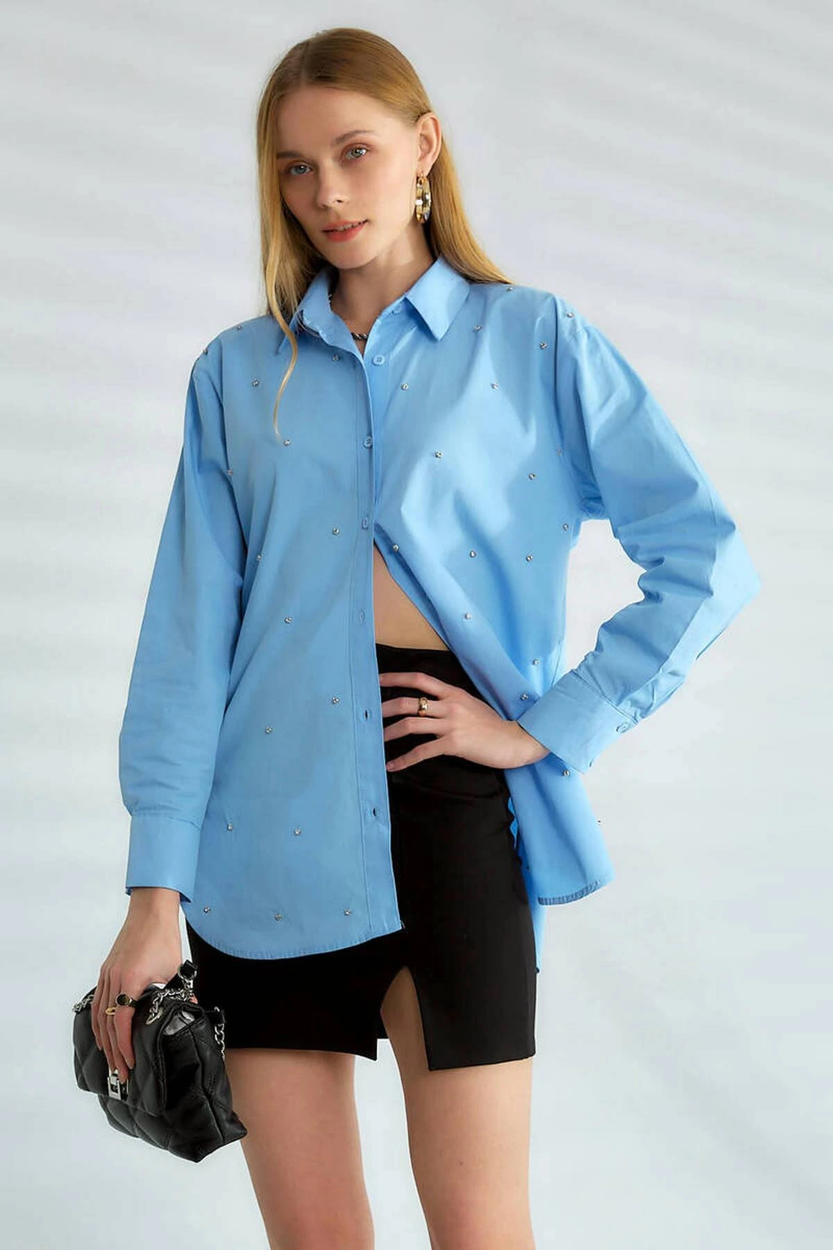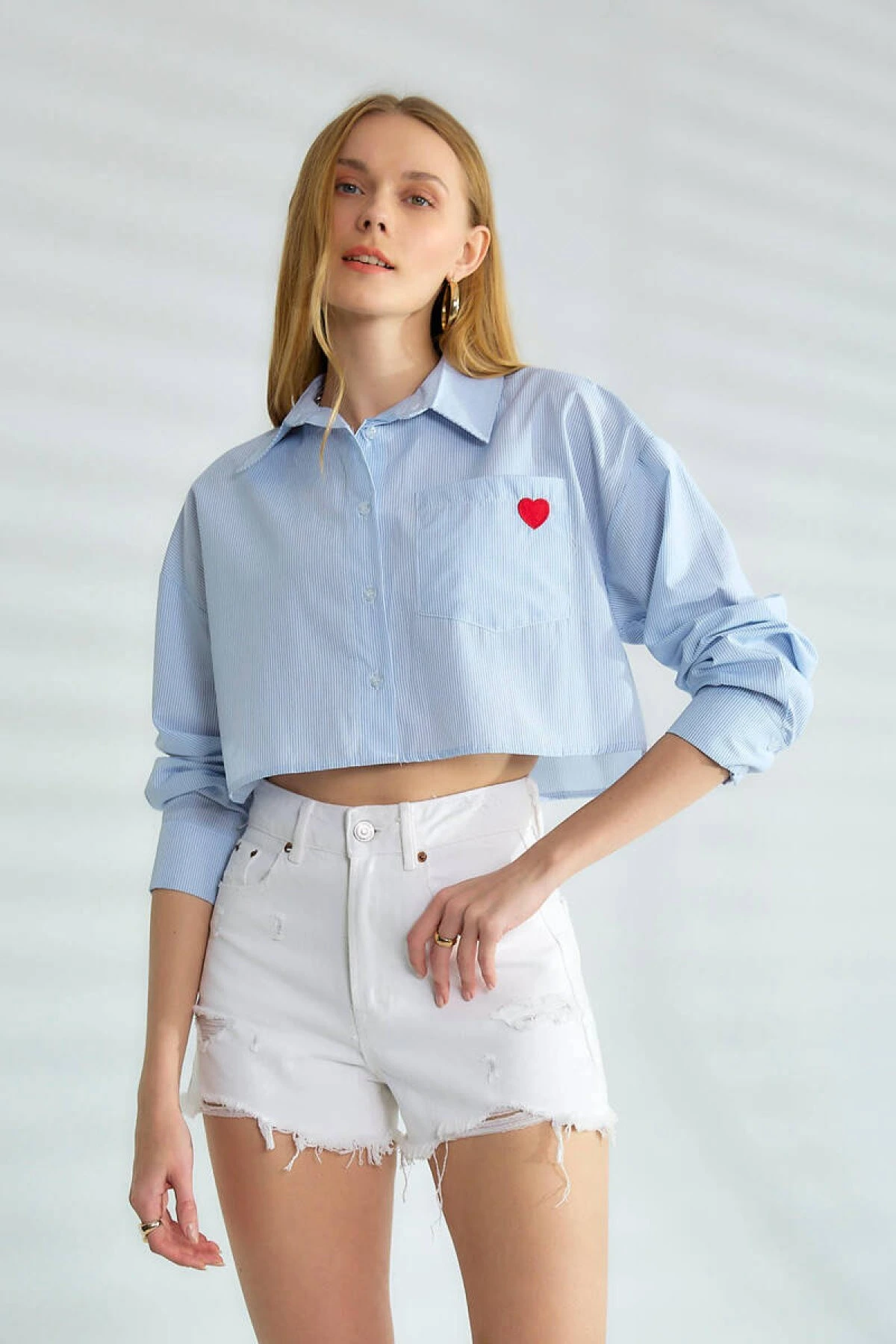ÇİZGİLİ CEP KALP NAKIŞ DETAY CROP GÖMLEK – MAVİ