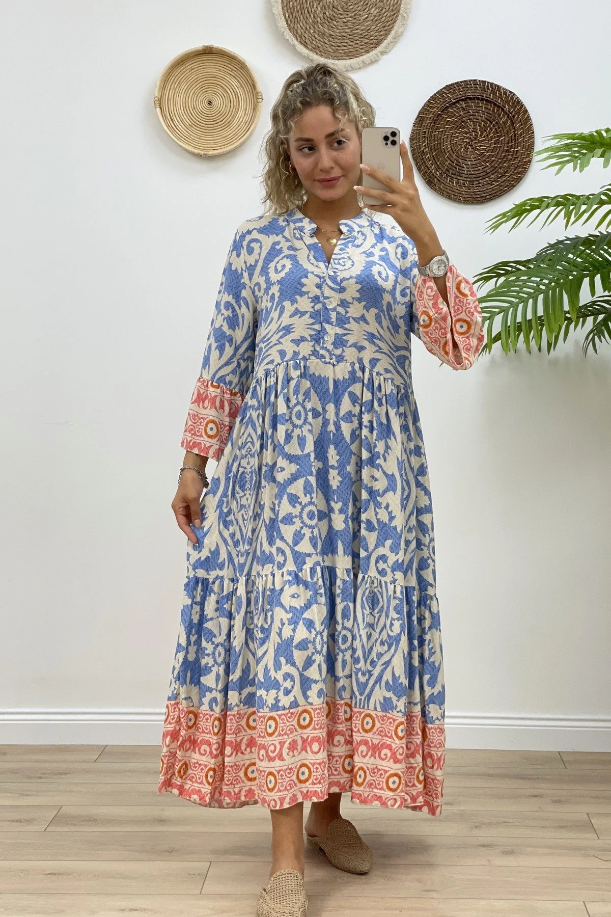 ÖN ARKA V MAXİ BOY KOT ELBİSE – MAVİ