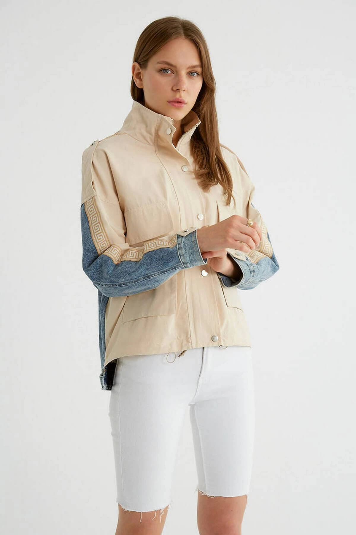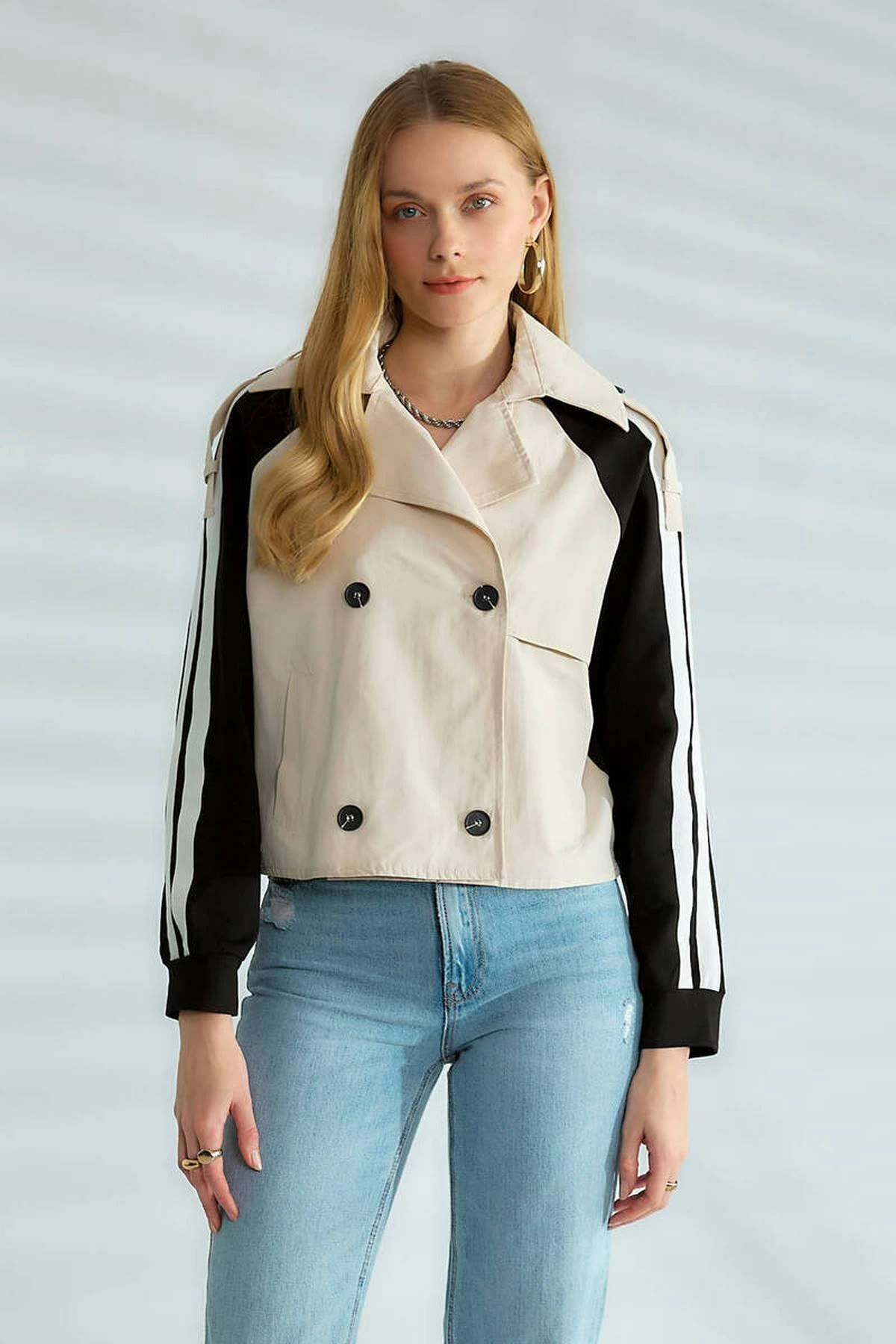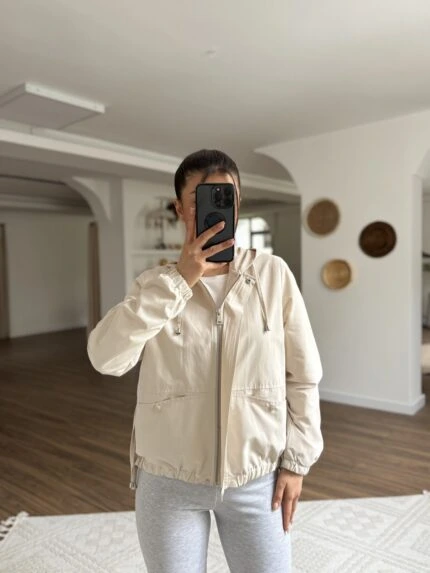KAPÜŞONLU KOL VE ÖN BEL LASTİK KISA VİSKON TRENÇ – TAŞ