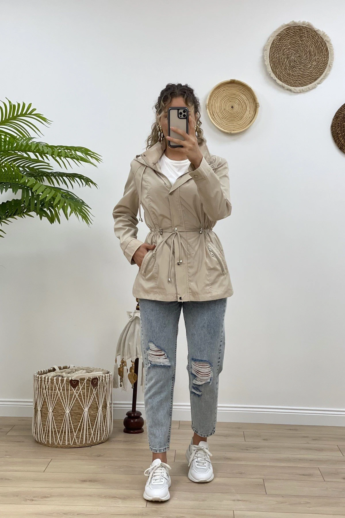 KAPÜŞONLU BEL BÜZGÜ CEP DETAY VİSKON KISA TRENÇ – TAŞ