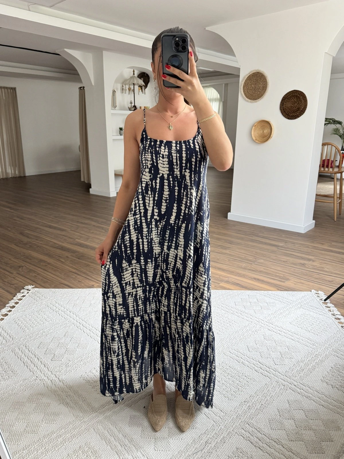 ÇİÇEK DESEN LİKRALI TAM BOY ASTARLI ELBİSE – LACİVERT