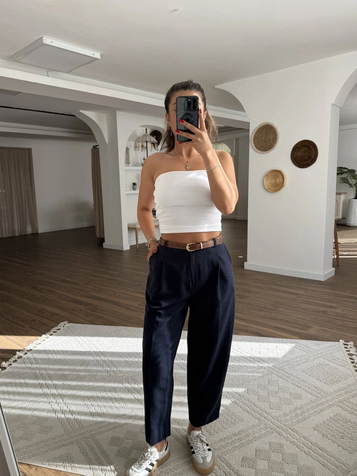 TEK PİLE ARKA KAPAK CEP KETEN KEMERLİ PANTOLON – LACİVERT